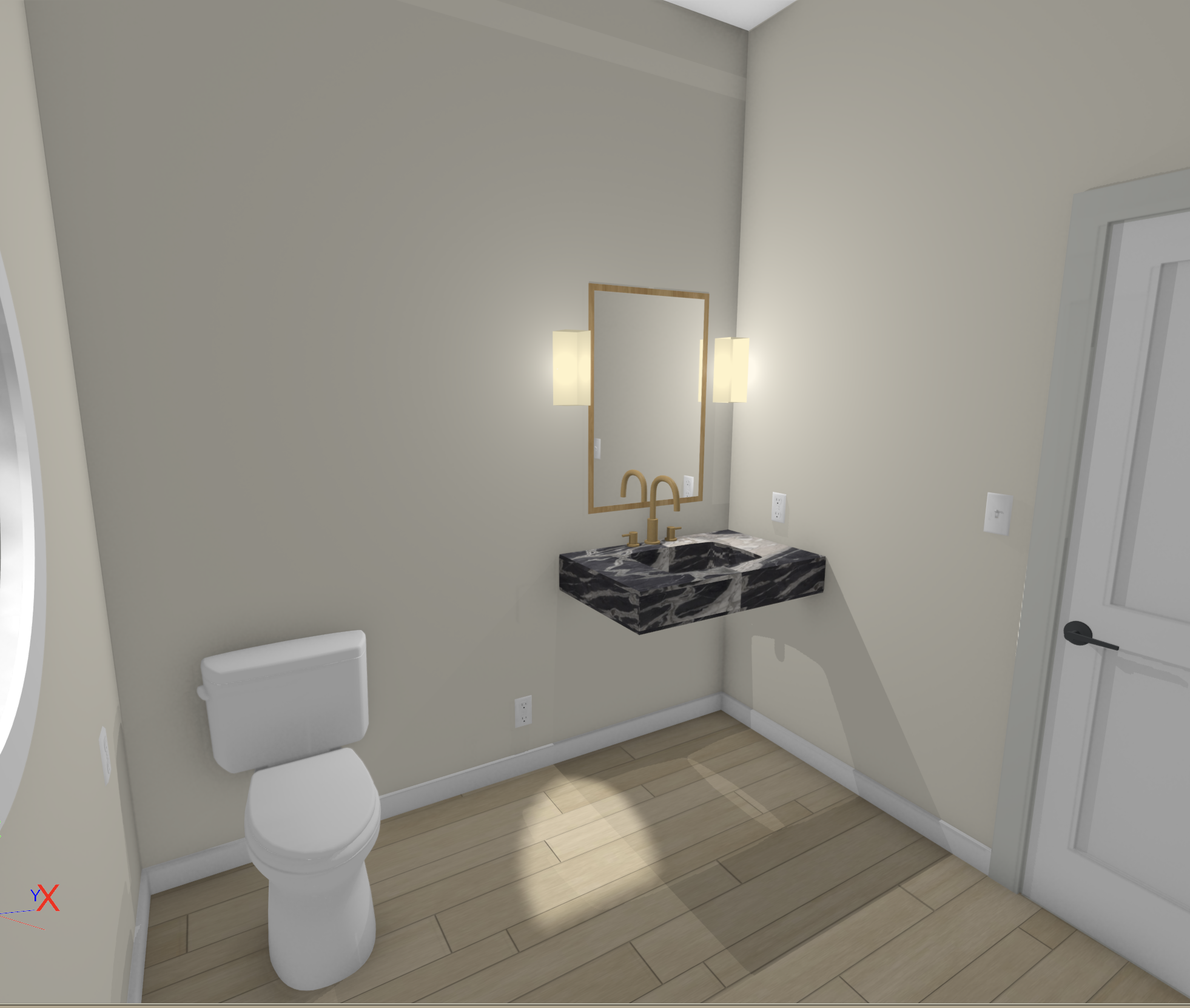 exterior shot design a powder room based off the mood board floating vanity