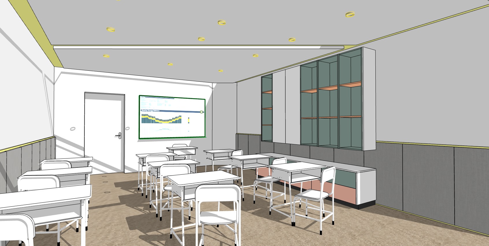 photorealistic bright render of the same children s classroom keep exact design and composition unchanged add warm led strip lighting in the ceiling cove all ceiling spotlights turned on subtle illuminated wall panels and warm led lighting inside the bookshelf make the room brighter with more natural light and a warm welcoming atmosphere add children s books toys colorful educational decor and playful accessories in the bookshelf preserve all original materials proportions textures and furniture layout