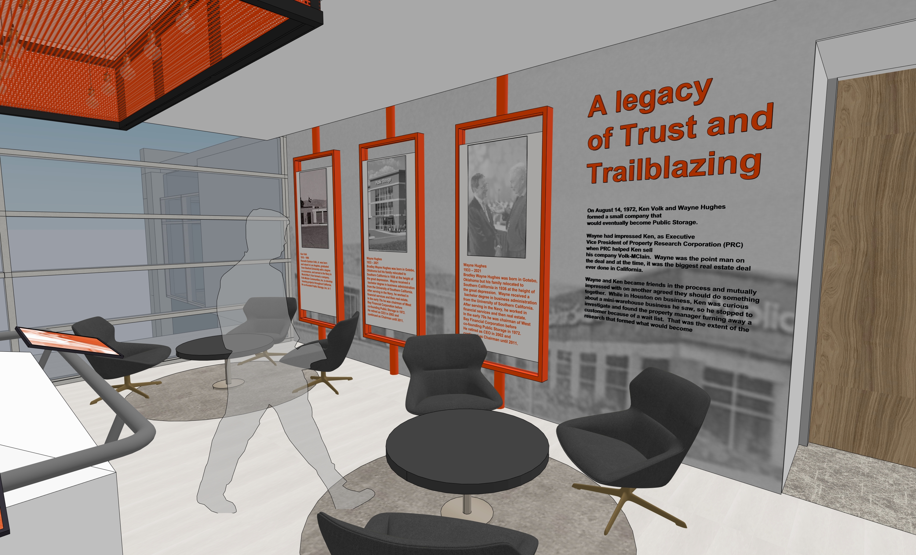 photorealistic interior polished tile floors white walls and light the space is lit up with soft ceiling soft lights back wall has black and white graphic and orange metal frames in front with graphics inside perforated metal orange panel box ceiling in the center bright lighting and overall environment is soft bright lighting view outside of clear glass of second story above looking down about 10 feet below aerial of parking lot with trees in the afternoon seating lounge furniture groups with coffee table and circular rug
