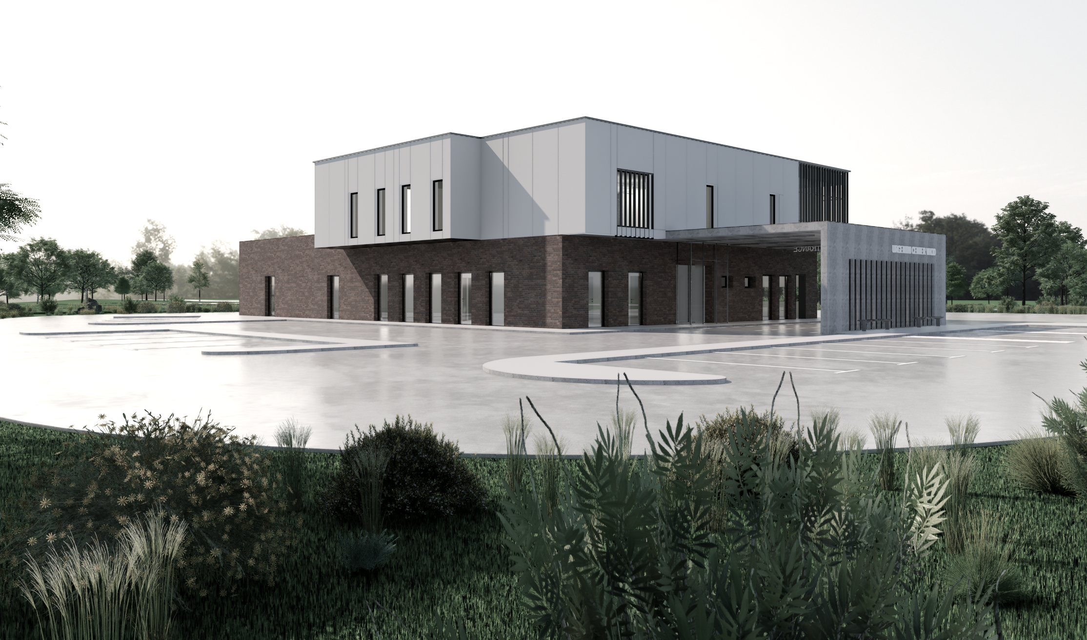 keep the pavement the same clouds in the sky lots of greenery and trees preserve all existing text on signs and surfaces grey reflections in the windows bright entrance light coming in architecture
