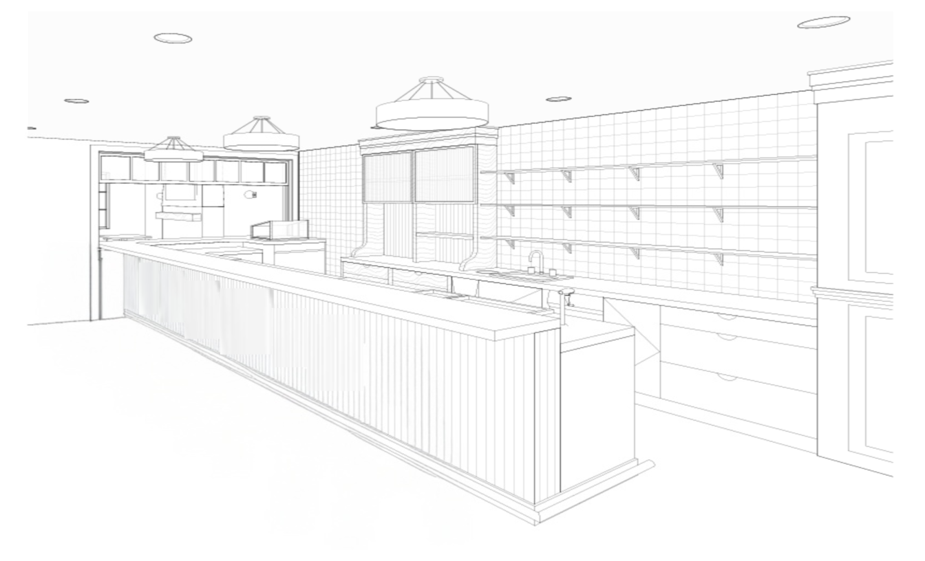 exterior shot deep green tile as backsplash from moodboard dark green on moodboard for front of bar top right of moodboard is the wallpaper for walls countertops are white quartz on moodboard natural oak wood for shelves modern classy vibe for bar