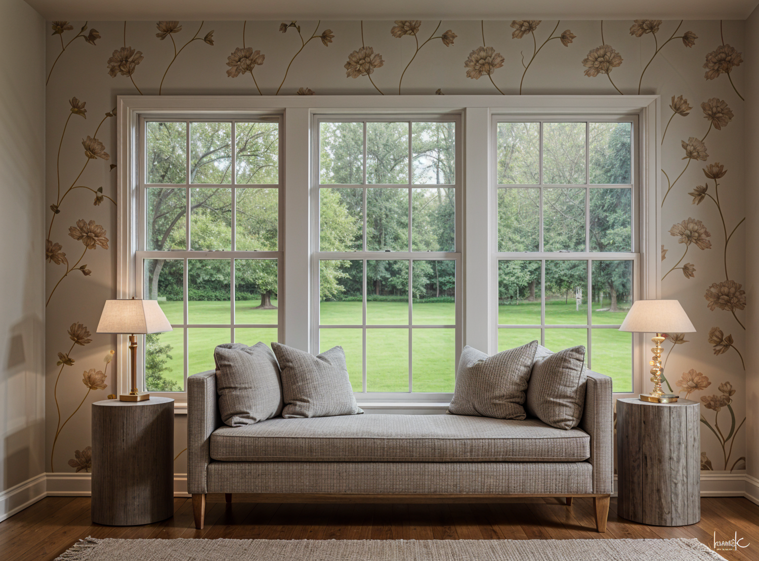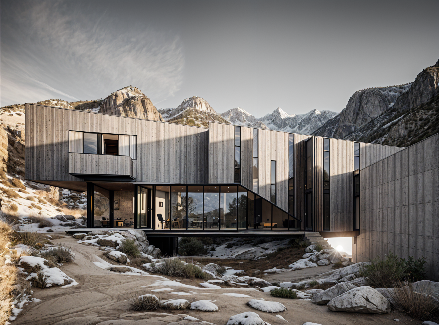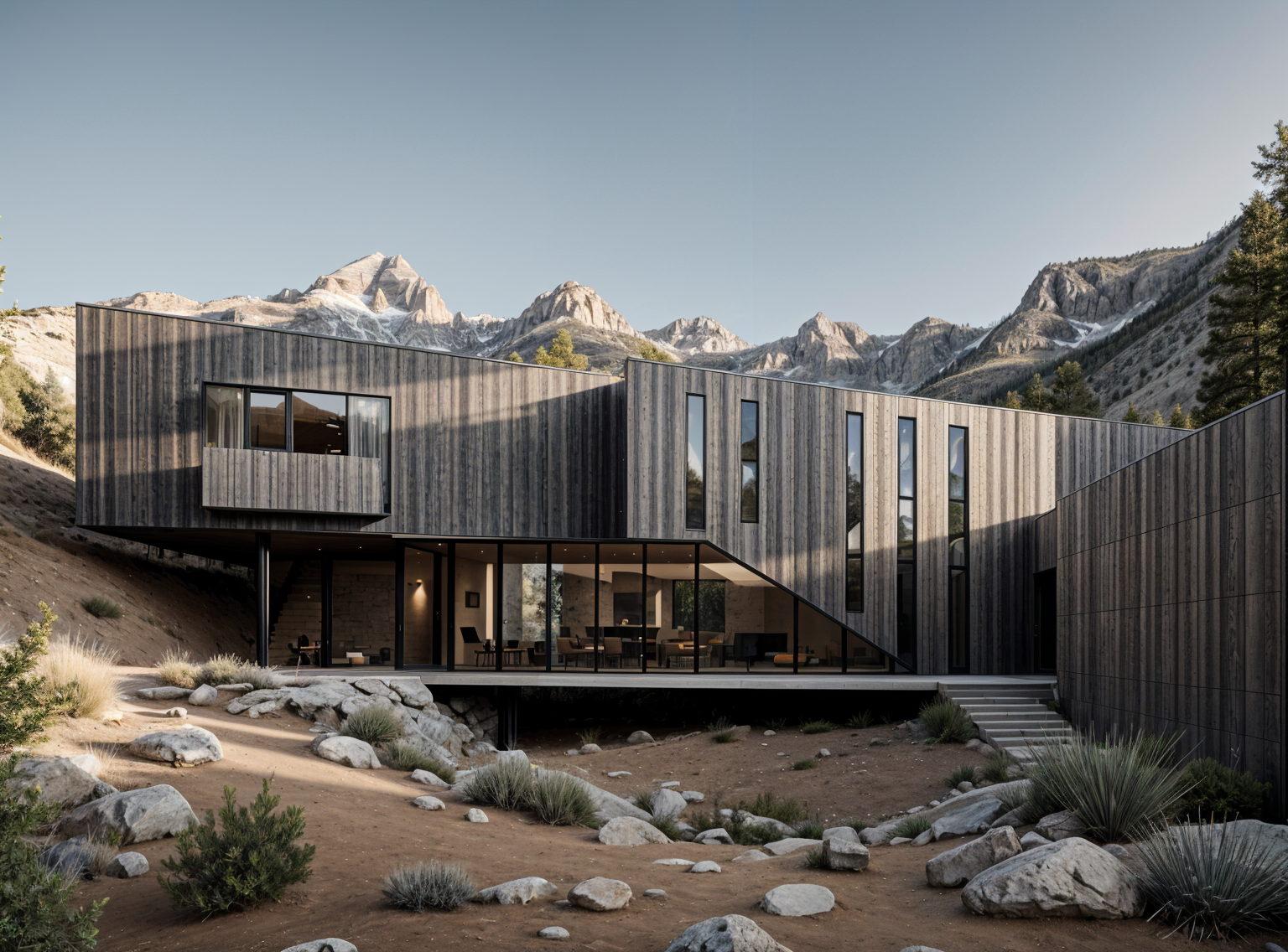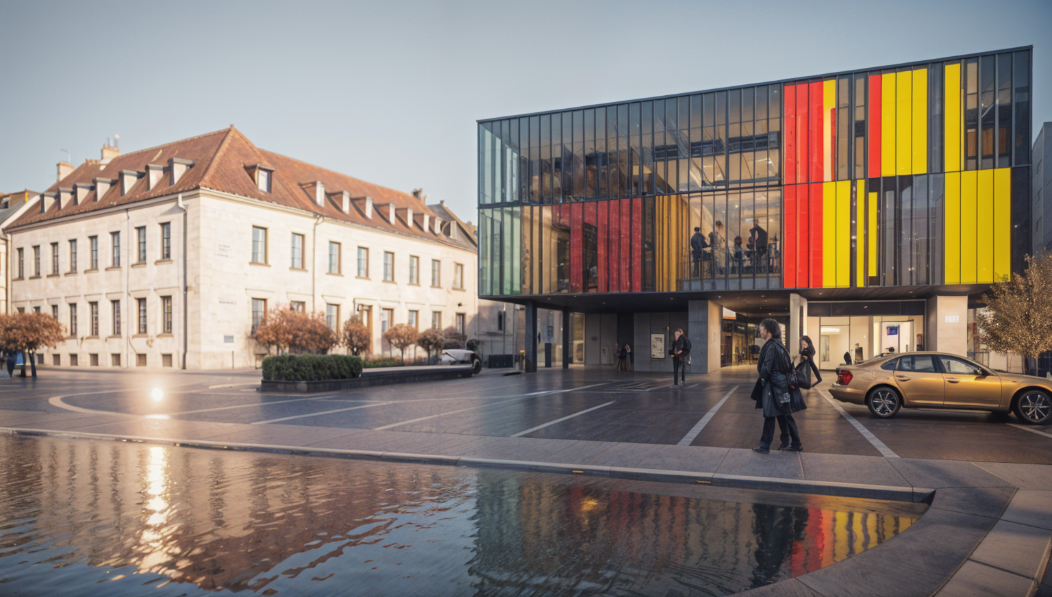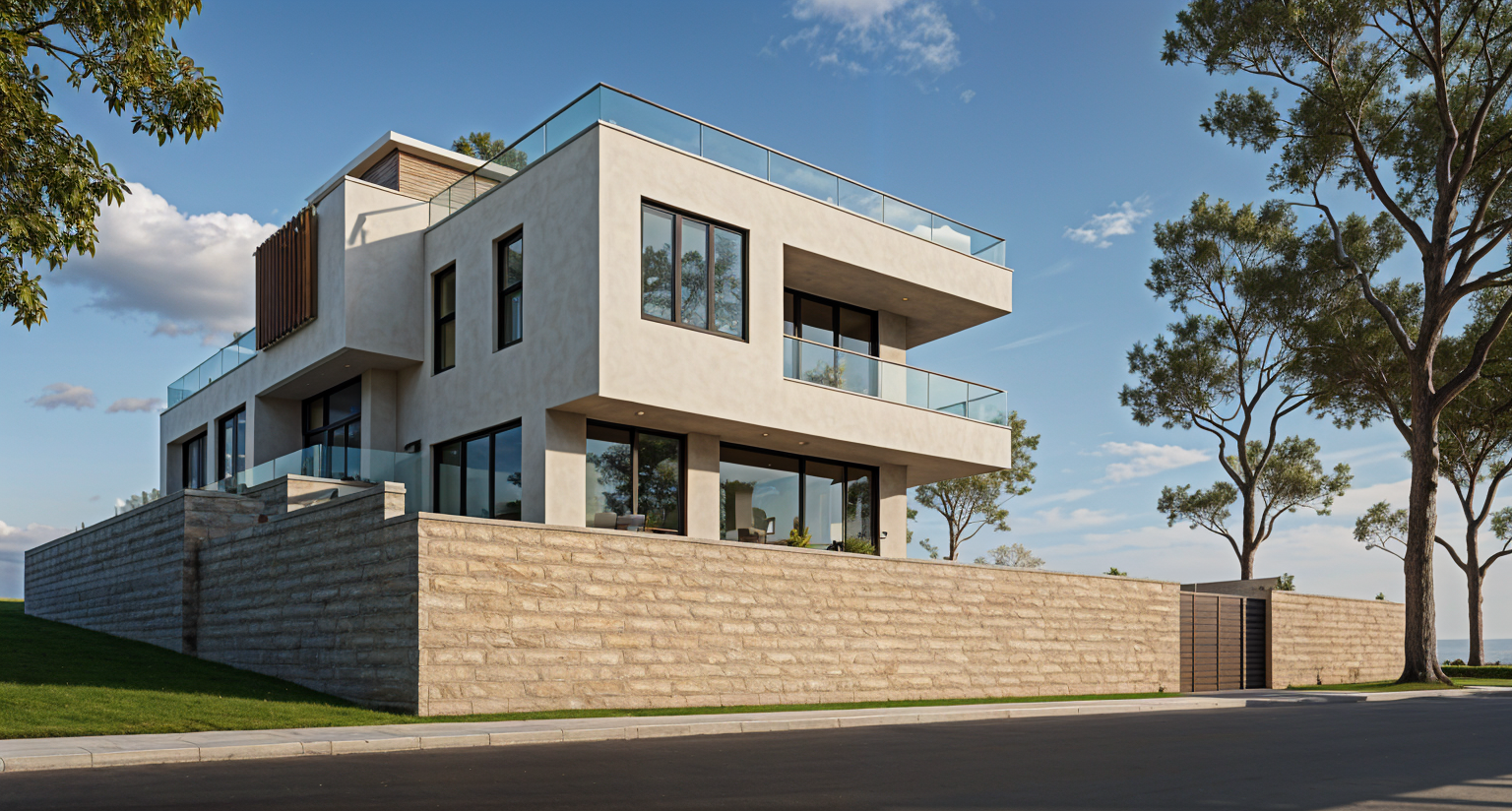 render a modern architectural scene featuring a series of contemporary townhouses with a minimalist design under a serene sky the buildings are primarily in soft white with textured stone elements in light beige creating an elegant contrast incorporate sleek dark brown accent panels and fencing for a sophisticated touch the sky is a calm clear blue with wispy clouds suggesting a peaceful atmosphere include lush vibrant green trees in front of the townhouses to add natural beauty and life to the scene