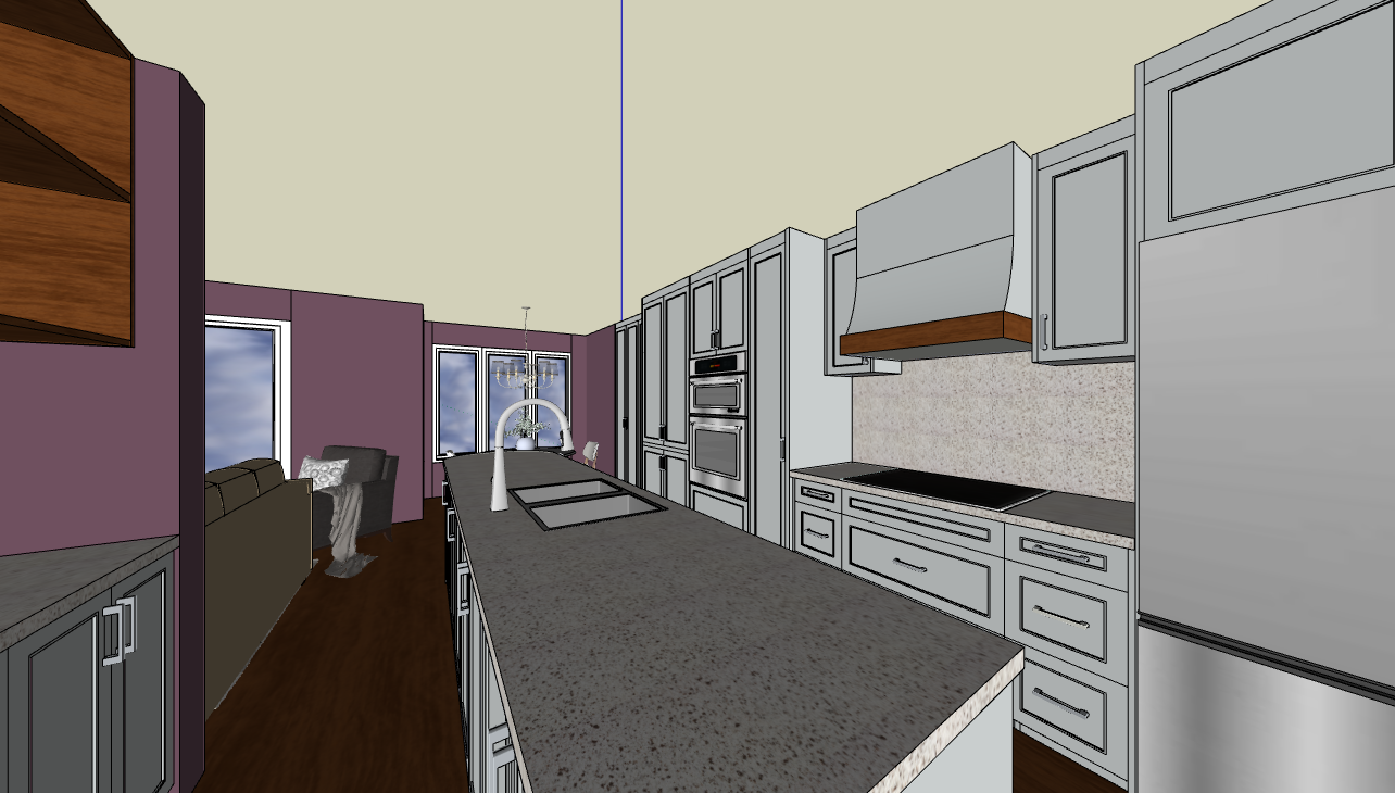 render the kitchen in perspective view the wall paint is benjamin moore af 630 the countertop and backsplash is lucent quartz droplets the cabinet colour is benjamin moore whitestone add led lighting under the upper cabinets make the floor a lighter carmel brown hardwood add pot lights in the ceiling