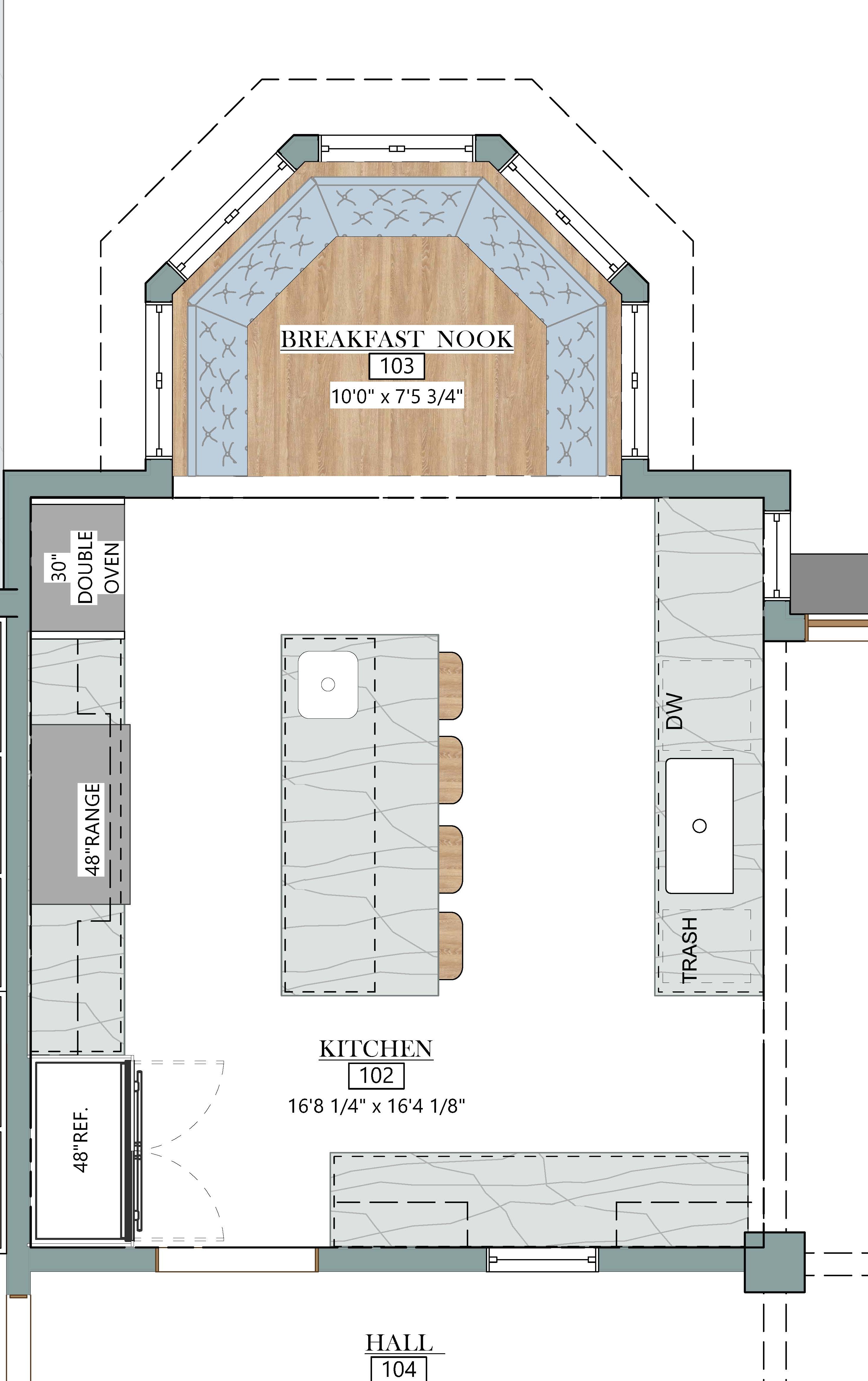 convert this floor plan into a realistic isometric 3d view of a kitchen show the space from an elevated angle with furniture walls and details visible reate realistic rendering of this kitchen plan use white oak wood floor for the finish and use neutral colors for the furniture keep the existing layout for the kitchen per the plan create the buildins for the breakfast nook use the same furniture as shows on the plan do not change the orientation of the floorplan