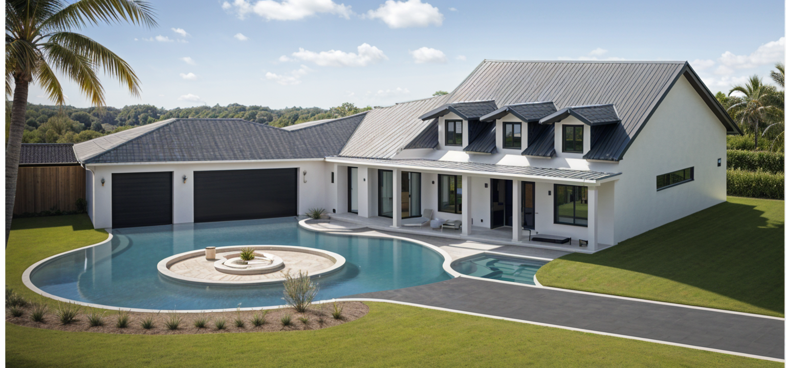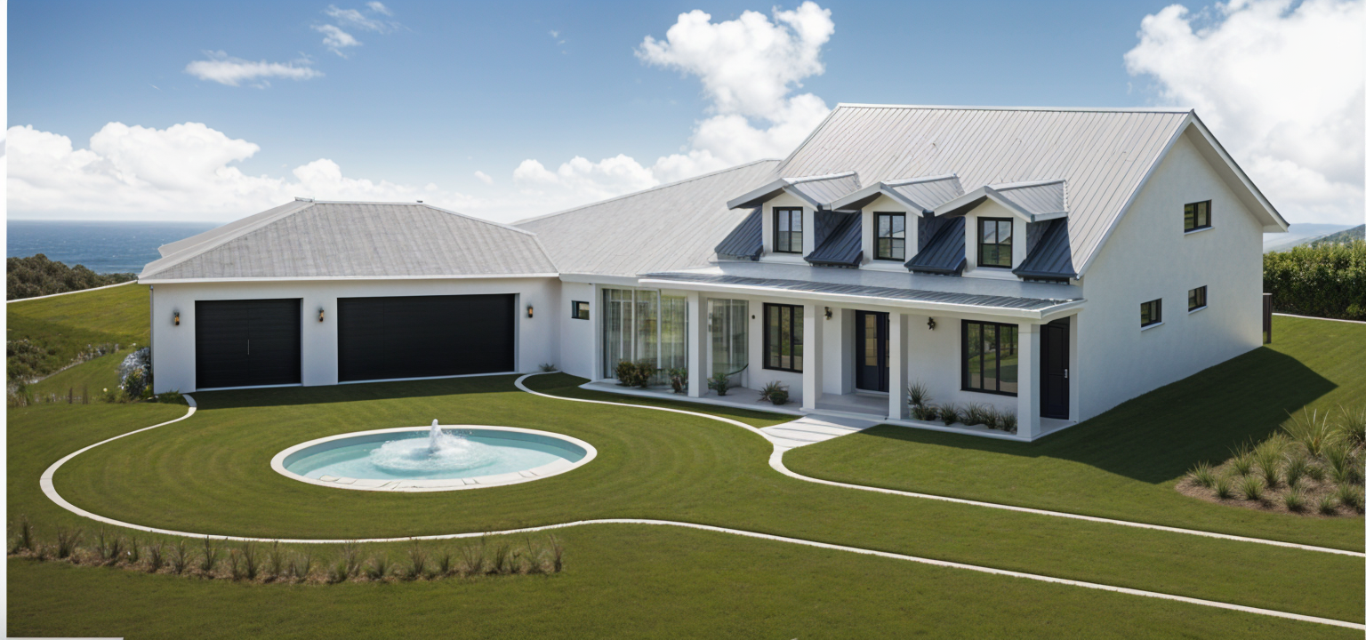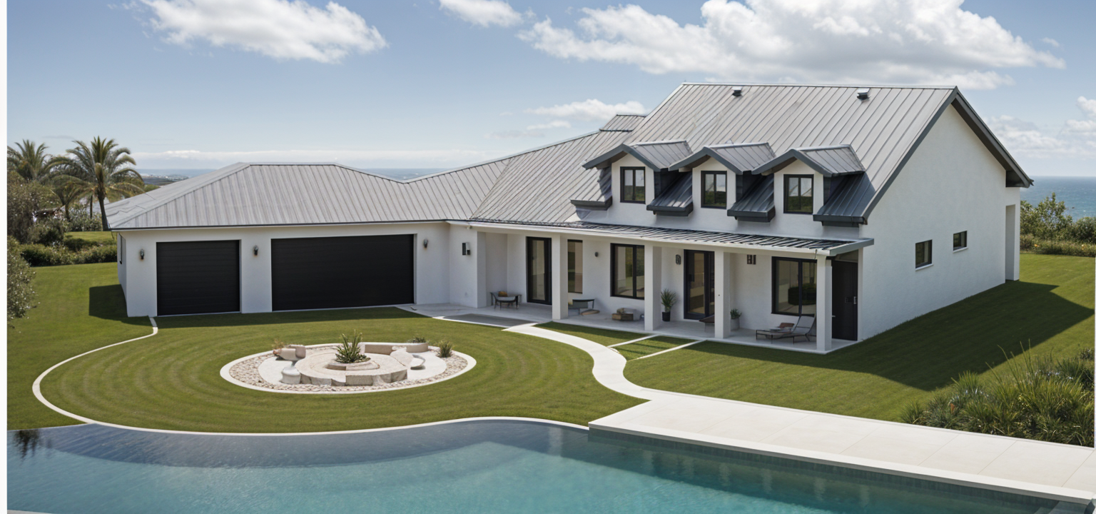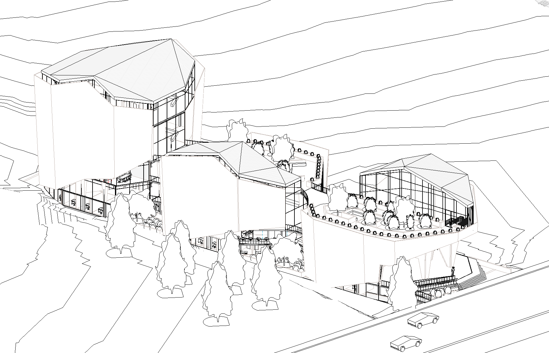 wide angle shot futuristic architectural complex with three interconnected buildings featuring moss covered fa ades reflecting the sky the buildings are designed with modern angular structures the landscape is lush and green with vibrant trees and plants scattered throughout the structure creating an eco friendly atmosphere the surroundings are set against rolling hills in varying shades of earthy browns and greens the sky is a radiant sunset with hues of orange pink and purple adding warmth to the scene the overall atmosphere is serene yet innovative highlighting a balance between nature and modern architecture