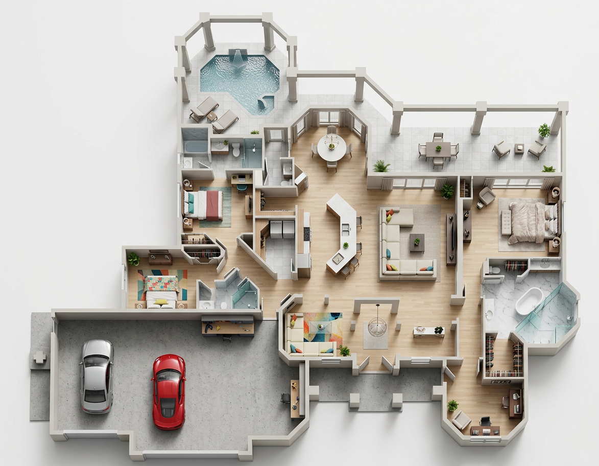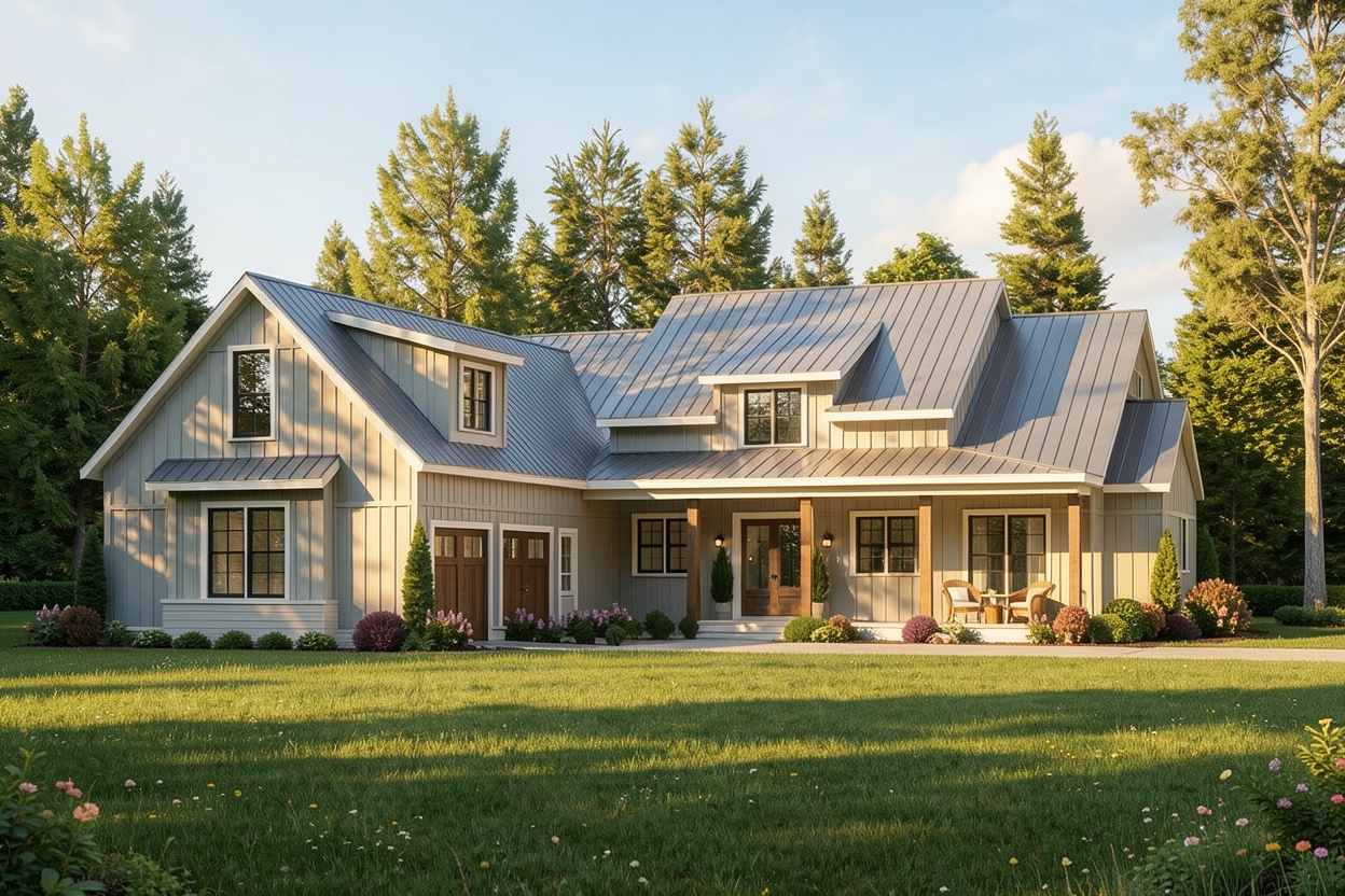 a modern two story californian style with light baige stucco finish and some mansory dark beige black tile roofing exposed wooden details the exact structure window arrangement patio columns balcony chimney rooflines foundation height and proportions exactly as shown in the reference image add a smooth concrete front driveway extending toward the house integrated naturally into the sloped terrain surround the property with a lush dense forest of tall mixed evergreens and hardwoods place the sun behind the trees so warm golden sunlight beams through the branches casting soft rays and subtle dappled highlights across the patio siding and grass create ultra realistic lighting crisp shadows detailed textures in the wood siding and glass reflections and a vibrant clear sky with light atmospheric depth render in hyper realistic architectural visualization quality 8k resolution