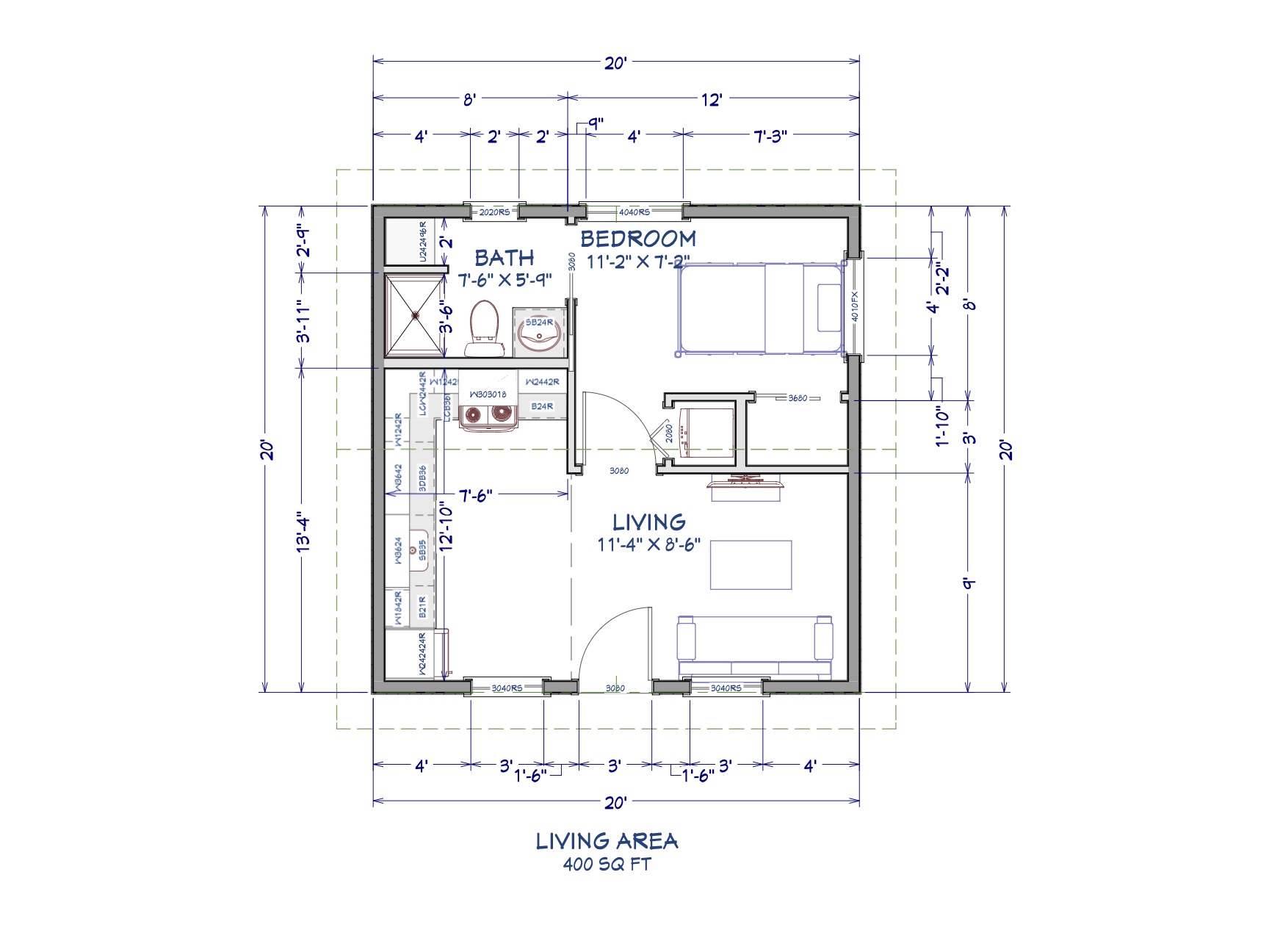 keep the design exactly the same as the drawing in all dimensions doors windows cabinets appliances and shower placement all cabinets in kitchen should be 42 tall white shaker style with crown moulding on top ceilings are all 9 foot tall furniture designs should be bright and bathroom shower should be white subway tile vanity in bathroom to be white oak elevated off the floor all door handles faucets and fixtures should be matte black add in modern clean bright design elements thru the home