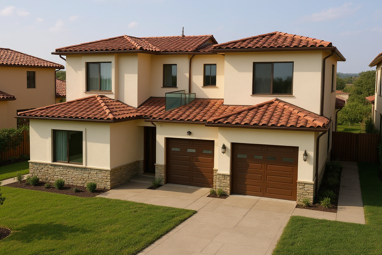international style exterior shot photo realistic modern spanish ivory stucco natural stone bronze windows deck architecture