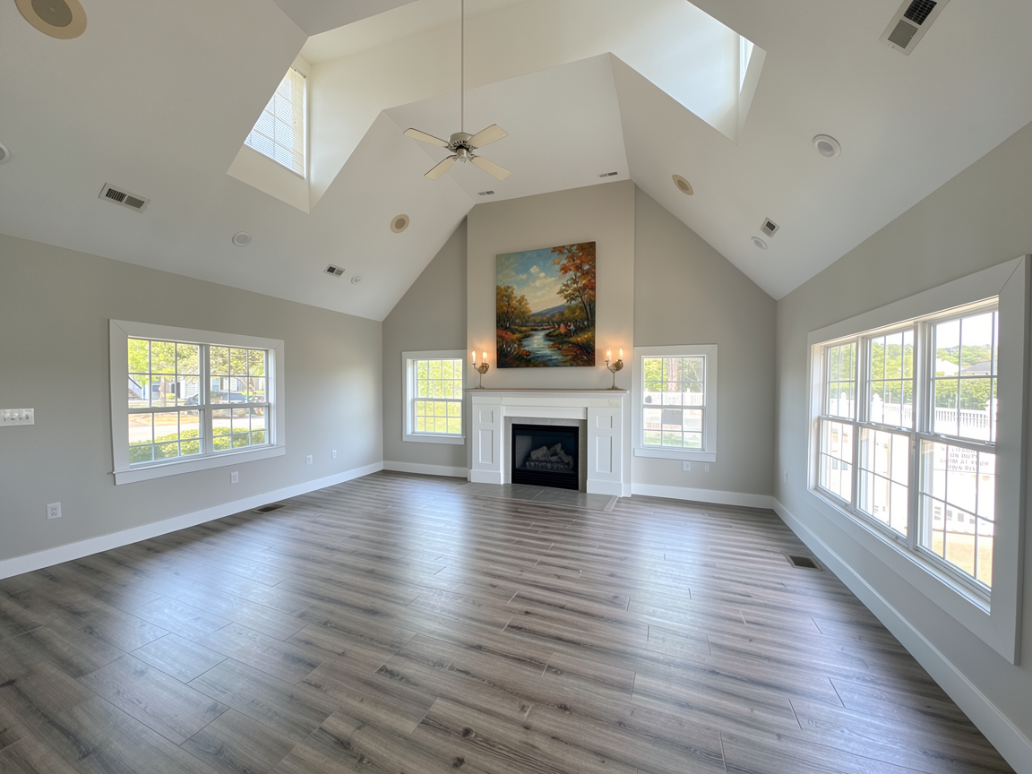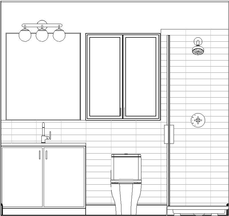 photorealistic interior elevation rendering of a modern spa like bathroom bright 3000k natural interior lighting clean editorial interior photography style soft shadows high contrast between warm wood tones and porcelain wall tile upscale residential feel layout shows illuminated rectangular mirror centered above a undermount single sink vanity with two door cabinet base flanked by open wall painted soft warm white on the left with a toilet to the right and a tiled shower enclosure on the far right with a wall mounted shower head vanity countertop in a warm creamy quartz shower pan is solid white ceramic vanity base cabinet in warm natural white oak wood with flat front double doors and polished nickel hardware undermount white ceramic sink with polished nickel faucet 16x16 light beige terrazzo tile floor with faint speckles of pinks blues and tans double door medicine cabinet in warm natural white oak wood with fluted glass panels inset in cabinet doors centered above toilet toilet is white shower wall tile in 3x12 matte concrete textured beige porcelain tile stacked horizontally wall behind toilet has the same tiles up to 46 with remaining walls painted soft warm white 3 light wall sconce with spa blue metal base and milky glass globes dimly illuminated with 2700k light centered over the vanity mirror mirror has thin polished nickel frame around its edges