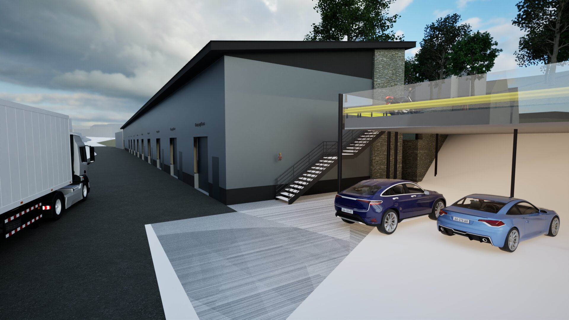 render a serene parking lot setting with a modern building use deep charcoal gray for the building exterior with soft light reflections the parking lot should have a smooth dark asphalt finish with crisp white lines include various cars painted in shades of cobalt blue metallic silver and cherry red the surrounding stone walls should be in natural gray tones add lush vibrant green trees in the background casting gentle shadows the atmosphere should be tranquil with soft diffused morning light breaking through fluffy partly cloudy skies creating a peaceful and inviting ambiance