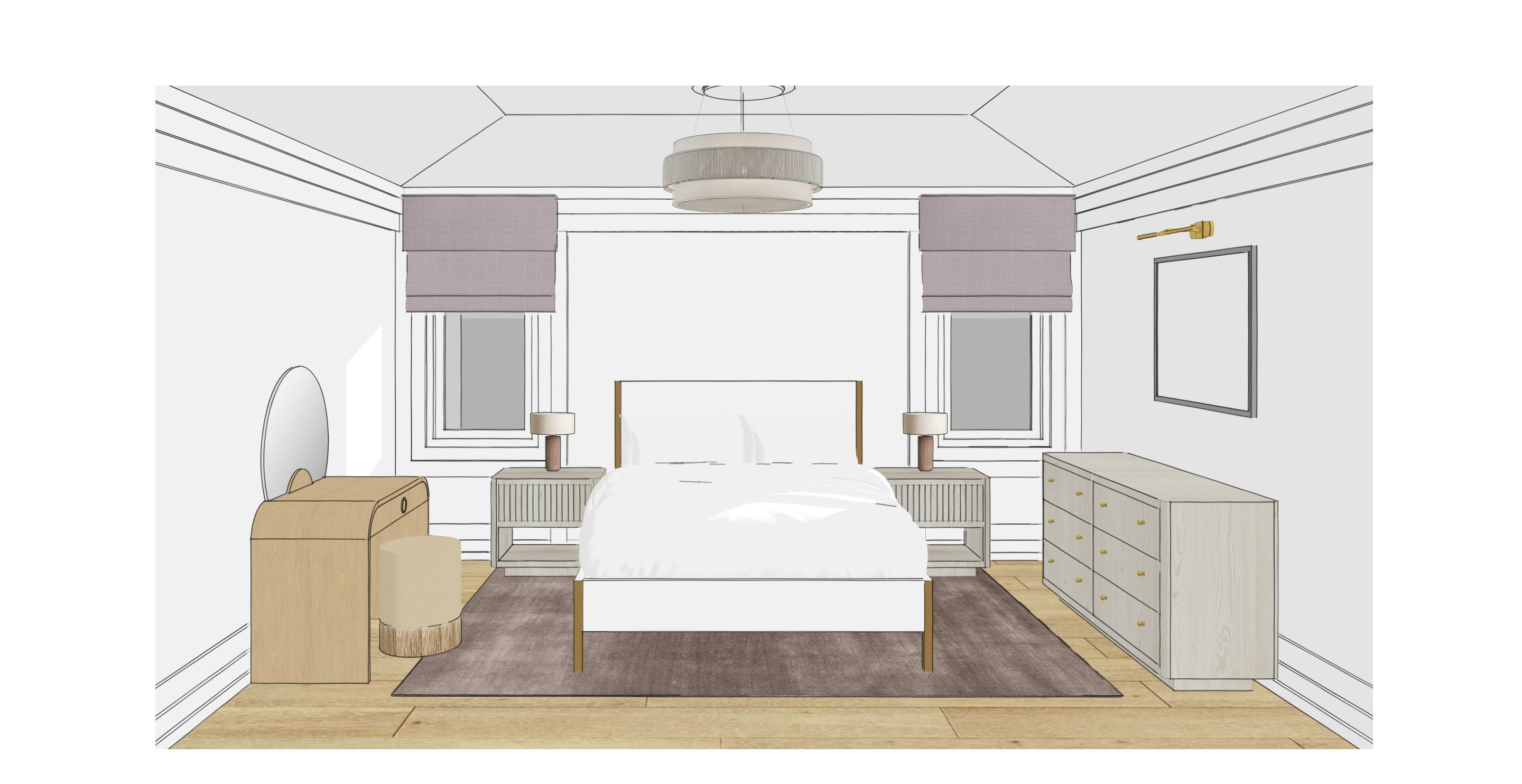 render a cozy contemporary bedroom with a serene and elegant atmosphere include a minimalist full sized bed with crisp white bedding flank the bed with modern wooden nightstands topped with chic table lamps featuring beige shades use soft lavender for the window roman shades and ensure the windows let in gentle natural light with tropical greenery outside the walls should be a warm white complemented by light wooden floors the room should feature a textured mauve area rug under the bed add an oval mirror above a sleek wooden vanity on the left side and to the right place a dresser in a light gray wood finish with gold handles art with a brass art light should sit above the dresser the ceiling light fixture should be modern with a textured white finish the room should exude calmness and sophistication with an emphasis on neutral tones