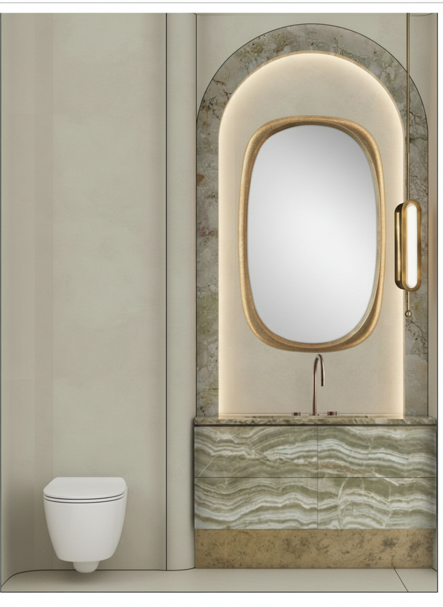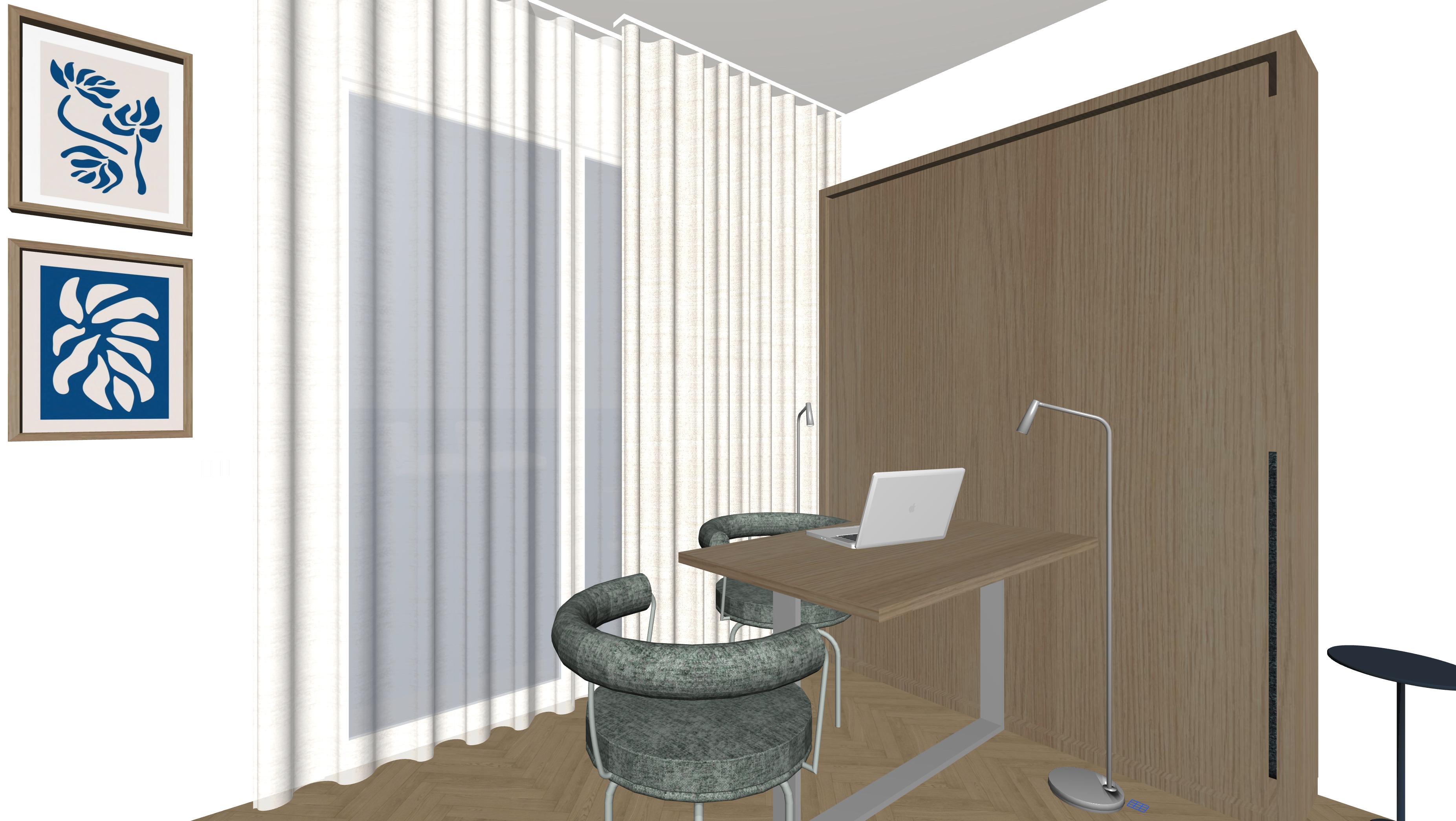 studio con armadio in legno rovere naturale scrivania in rovere e gamba cromata sedie di colore verde salvia scuro tavolino a destra di colore blu scuro le pareti sono bianche di fianco alla scrivania ci sono due lampade da terra cromate accese le tende sono una leggera e una pesante di colore beige chiaro fai entrare un p di luce naturale dalla finestra e metti uno sfondo di chiome di alberi e case visti dall alto metti qualche oggetto di camera studio