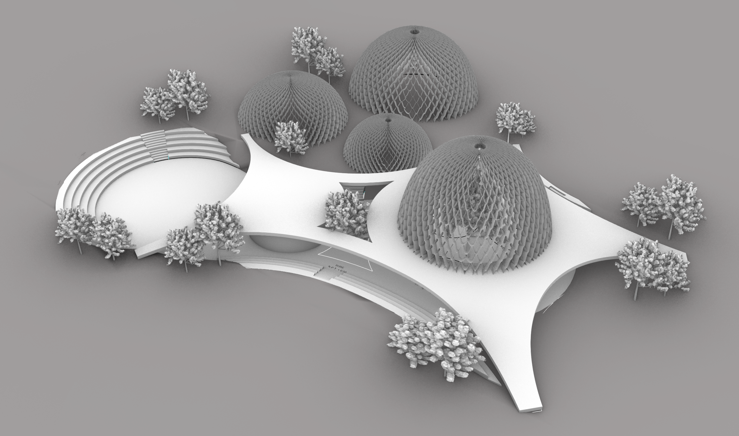 modernist botanical garden grass vegetation concrete aviary domes steel architecture