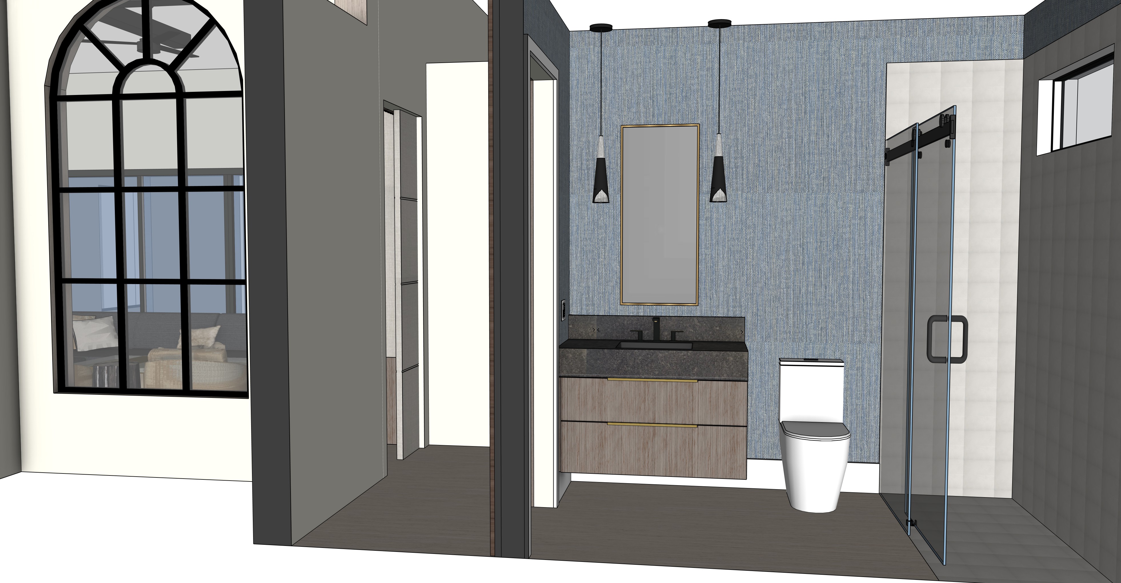 floating vanity toilet is not floating soft blue wallpaper 2 modern black pendant lights light wood plank tile floor
