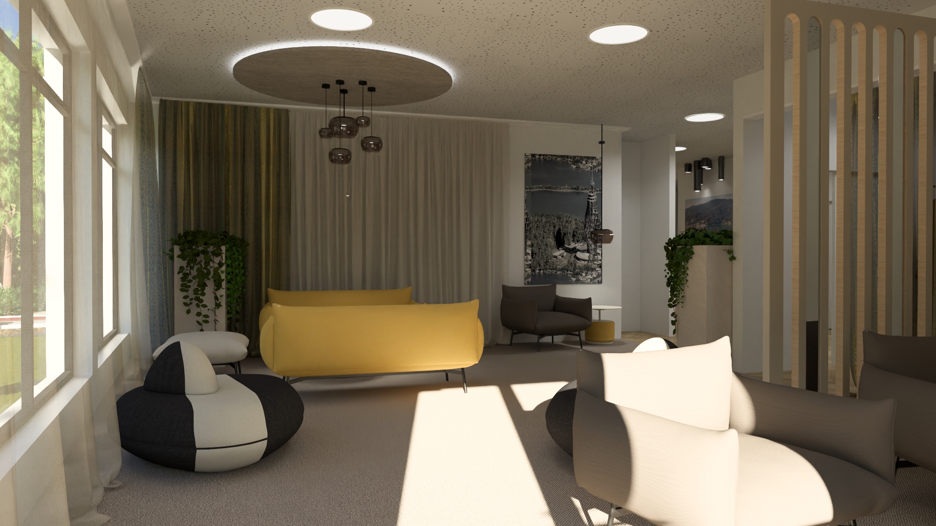 f ge ein zwei personen dazu und noch etwas dekoration und lass das licht noch etwas realistischer aussehen und auch das gesamte foto und vorh nge sollen sehr realistisch aussehen entferne die 3 personen rechts