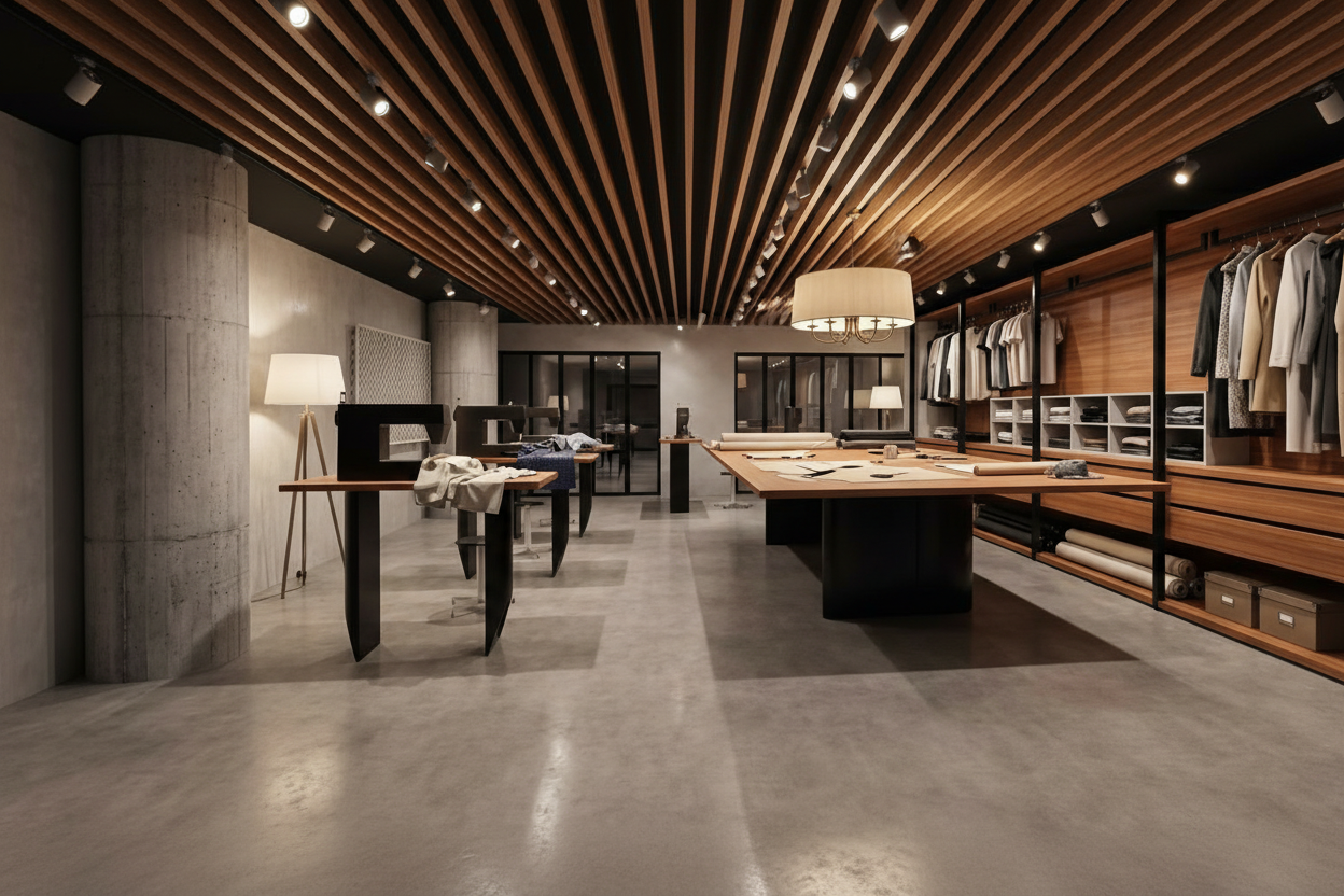 black ceiling seamstress workshop change clothes to cloth material storage change black sewing machines to real ones light up