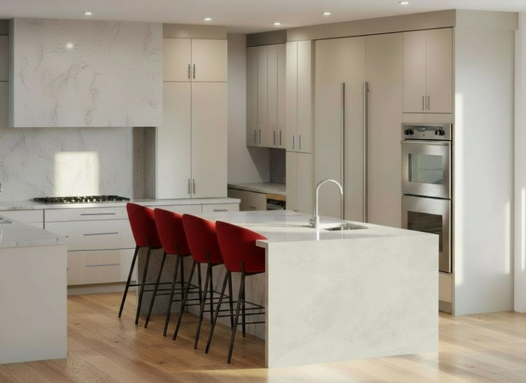 keep all the materials the same and lay out make the cabinet hardware look realistic all in nickel and make the whole think photo realistic