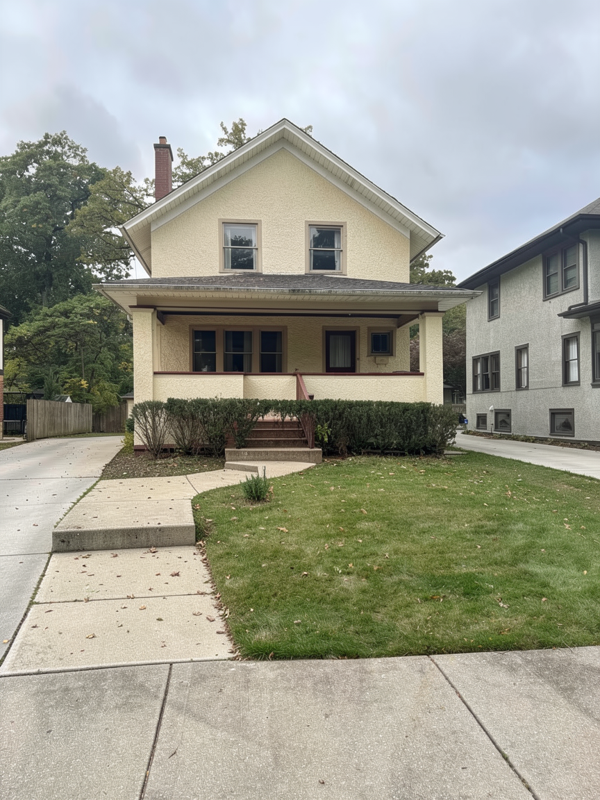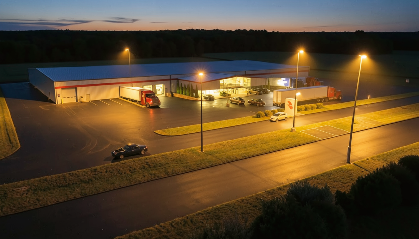 show scene later in the afternoon near dusk show lights turned on show three small light poles in front of building