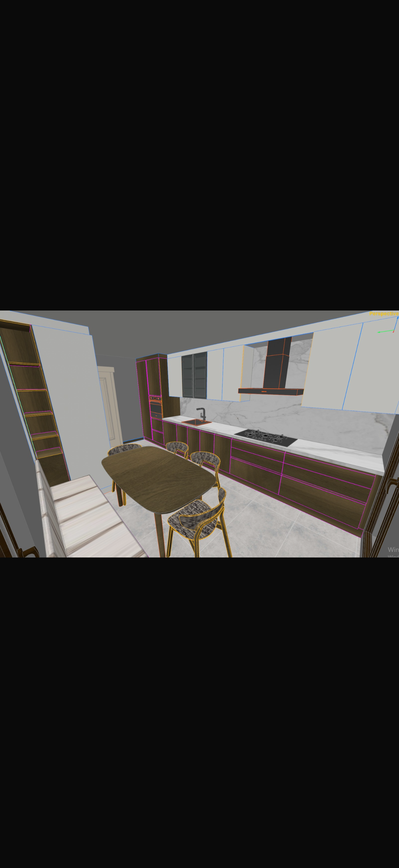 there should be spotlights on the ceiling there should be led lighting under the upper cabinet tea should be brewed above the stove the color of the seating bench should be the same as the chairs there should be led lighting under the shelves the floor should be marble there should be led lighting inside the glass covers above the sink