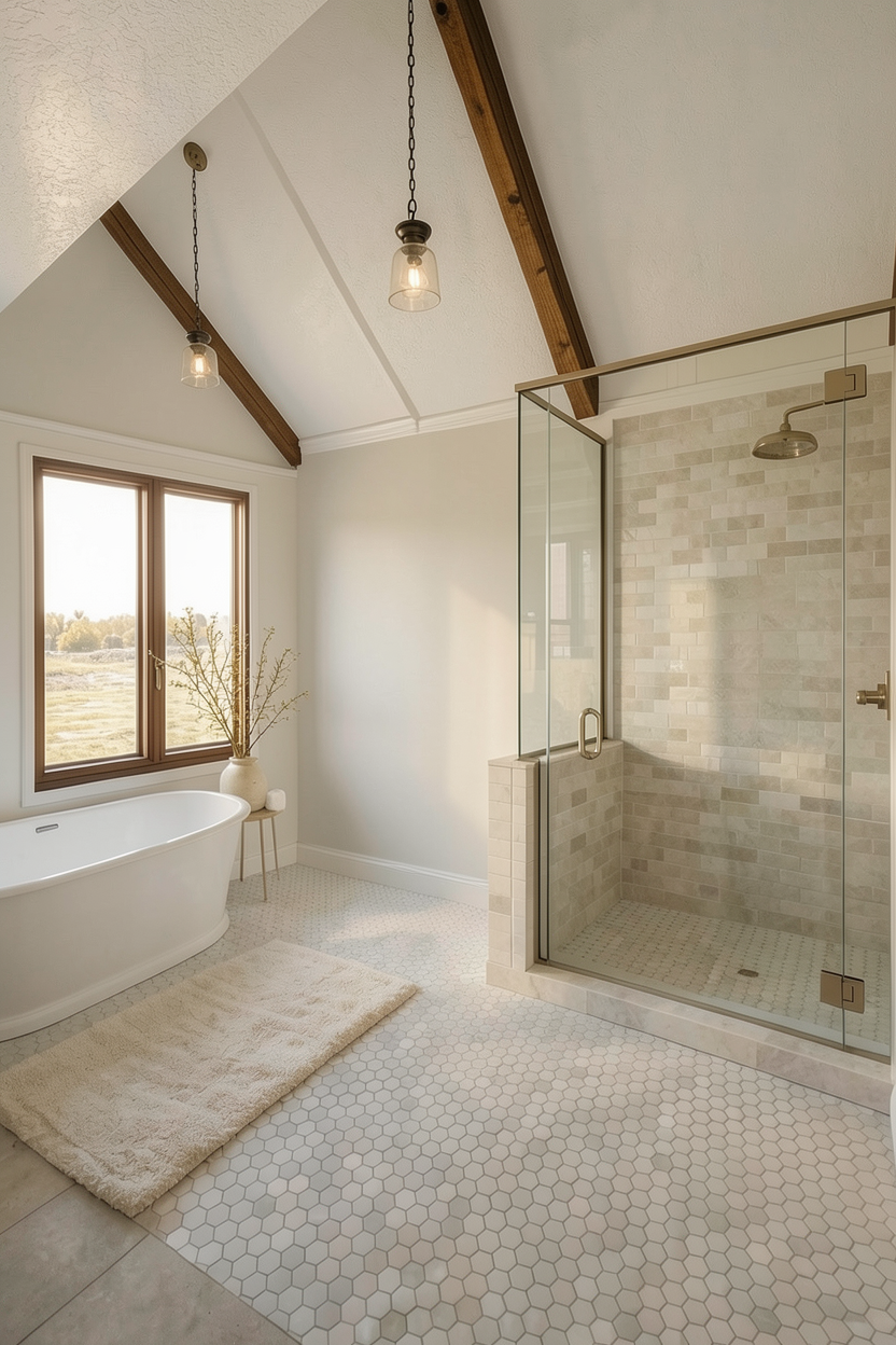 maintain the structure and do not add anything new remove the small side table and contents on it paint the wood window panes black do not change the style of the window do not add another window relocate the tub to be centered with the window