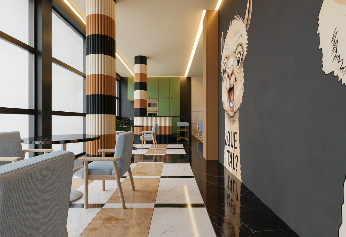 e una palestra a terra abbiamo un pavimento in parquet in rovere chiaro continuo a liscio la porta di ingresso in vetro cannettato infondo ci sono due grandi specchi ad arco a filo lucido e non ci sono altri specchi solo la parete degli spogliatoio nera i pilastri in ferro sono neri non ci sono strip led come illuminazione come illuminazione abbiamo dei binari neri con faretti neri a luce calda fai entrare un p di luce naturale dalle finestre metti qualche oggetto come zaini palestra attrezzi e borracce