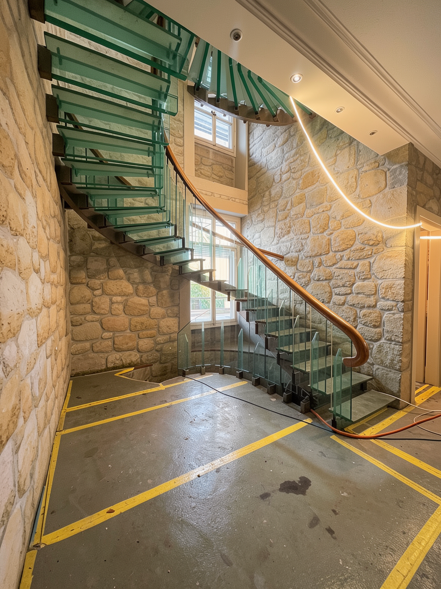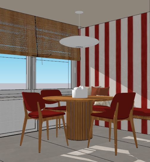 photorealistic architectural interior render of the same dining corner shown in the reference image maintain exact geometry and layout large format beige matte porcelain floor tiles with subtle texture and realistic grout lines red and white vertical striped wallpaper with visible woven fabric texture slightly soft textile surface white rattan radiator cover with white lacquered wooden frame and top edge natural cane roller blinds woven reed texture filtering daylight from the window round wooden dining table with vertical slatted base in natural oak red upholstered chairs with wooden structure japandi style white paper pendant lamp soft diffused light natural daylight entering from the window realistic shadows physically accurate materials high detail global illumination sharp focus do not modify proportions or furniture placement