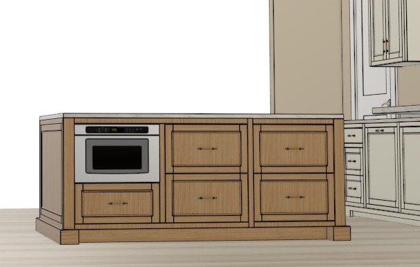 the island is rift white oak the cabinets on the back wall are white dove the opening leads into the living room