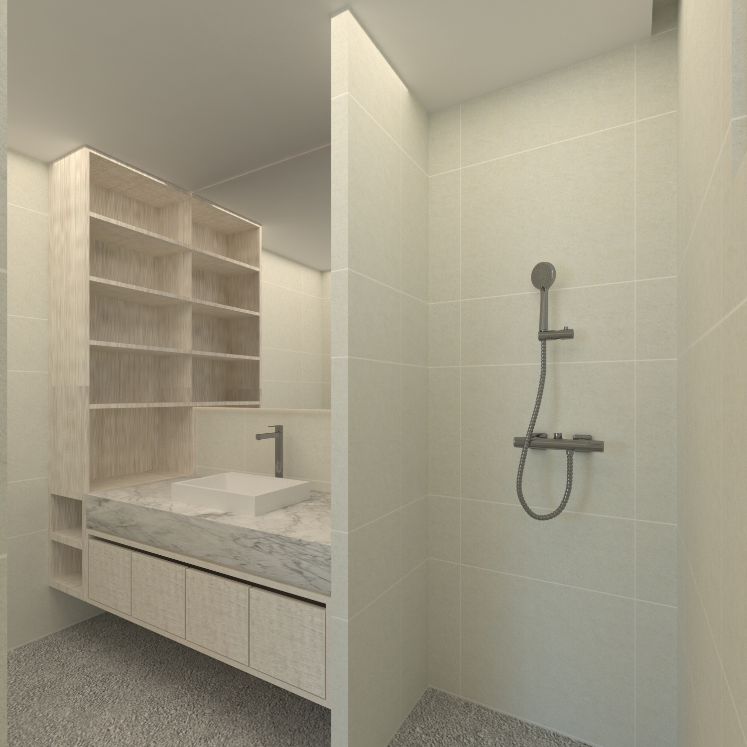 luxurious interior clean beige wall tiles clean light grey floor tile light wood cabinet