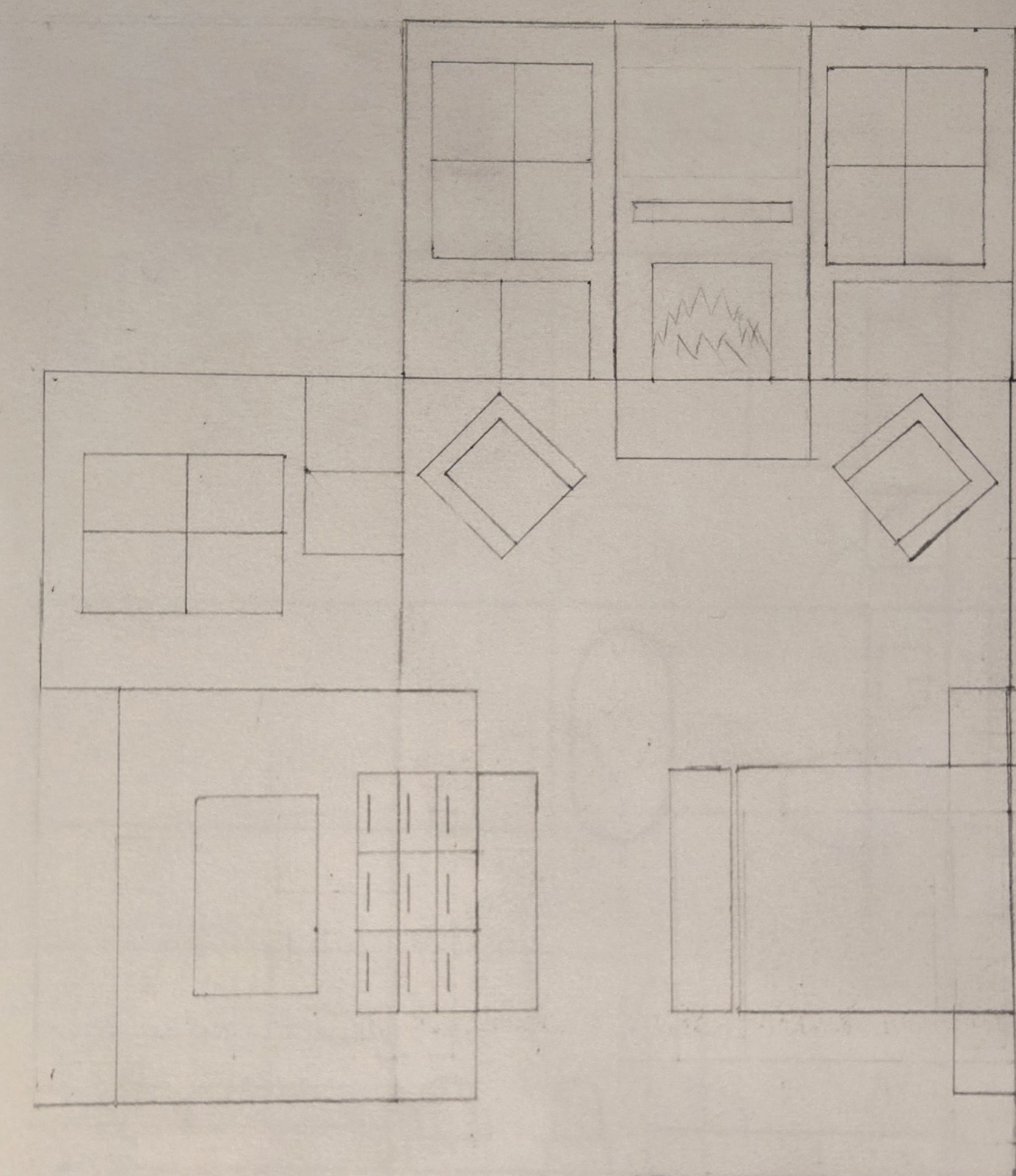 the picture is a floorplan and elevation of a master bedroom use soft neutral colors like beige for the walls and white oak floors and modern organic design for a cozy and elegant atmosphere directly across from the bed is a dresser with a large tv above it there is a fireplace with chairs and large windows to the right of the bed generate a realistic 3d render using a modern organic design use warm wood for cabinets beige for walls and white oak for floors