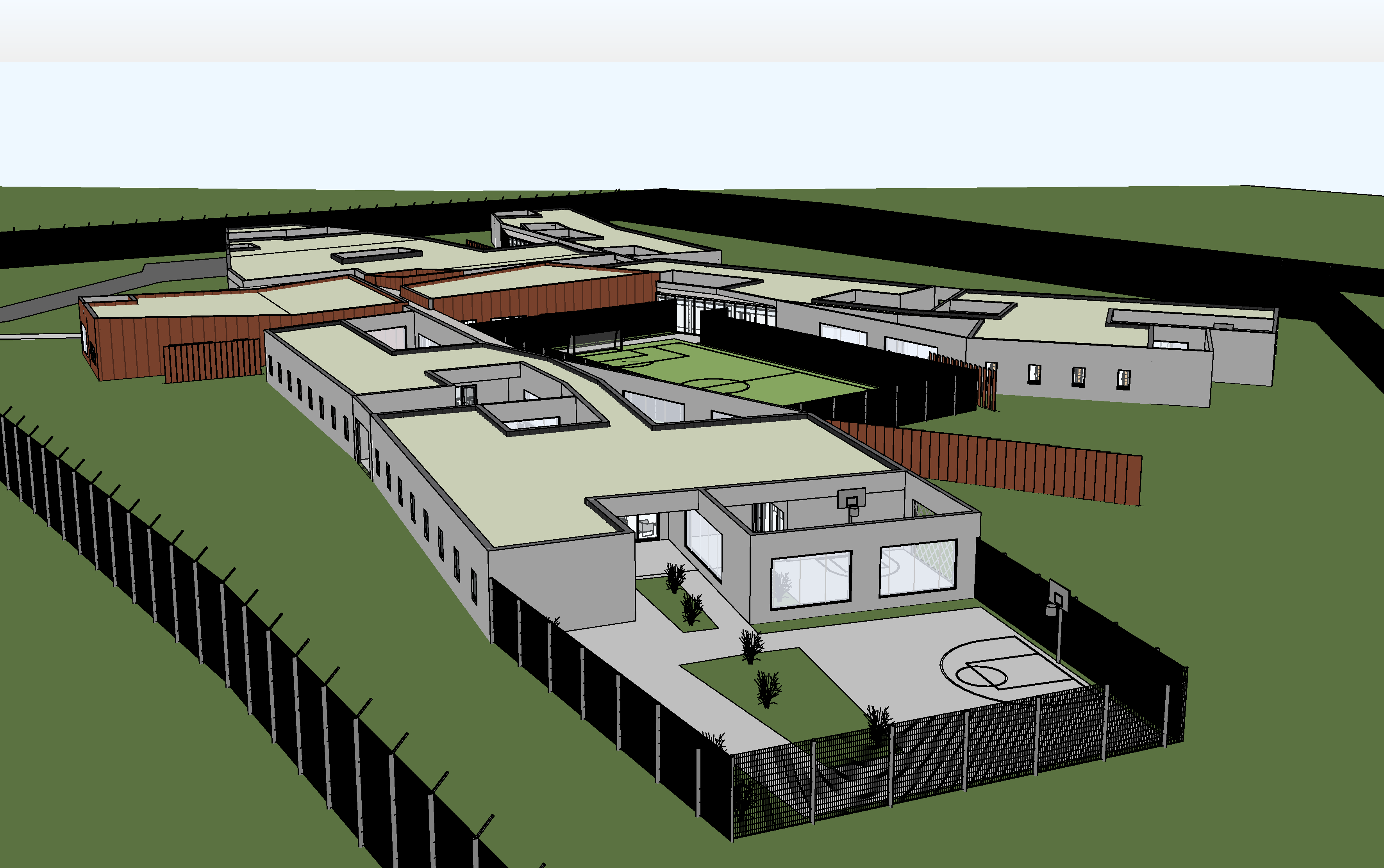 the weather needs to be a little cloudy but a little bright the brown color on the building is corten steel the grey color is concrete and the green color on the roof is grass