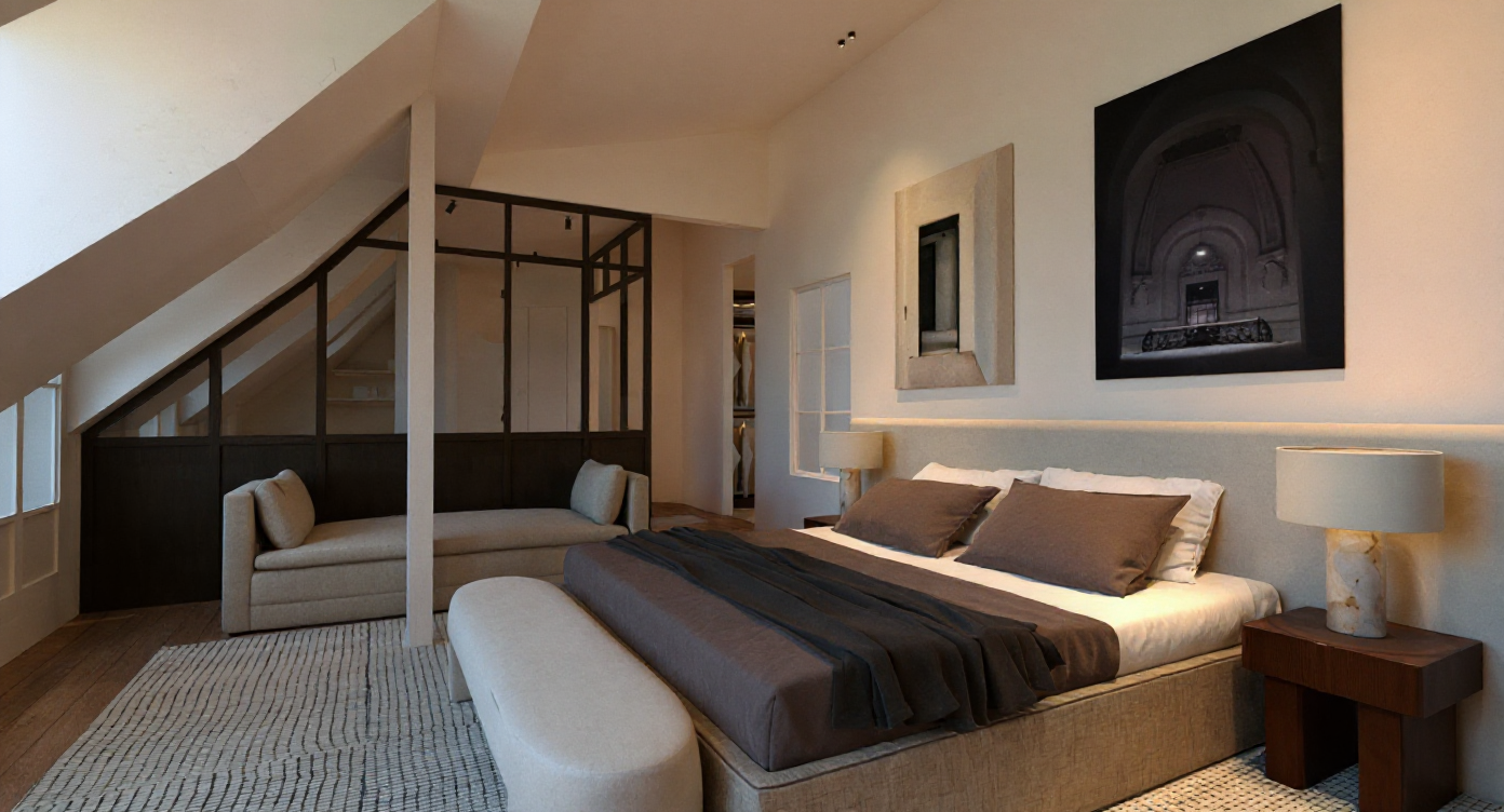 maintain direction of light turn on on the table tables lampes it is daytime maintn light from the spots on the cealing turn bed linen in white the window frame wall is made of medium oak