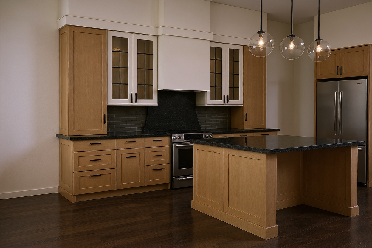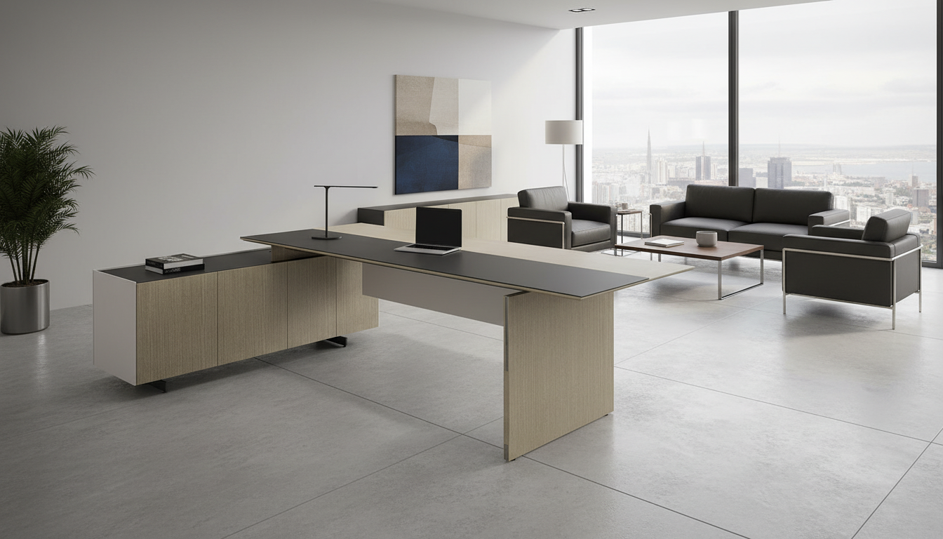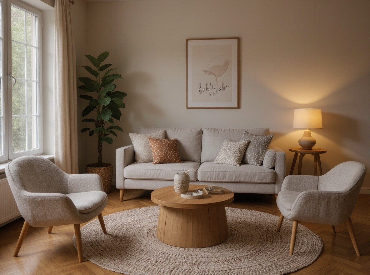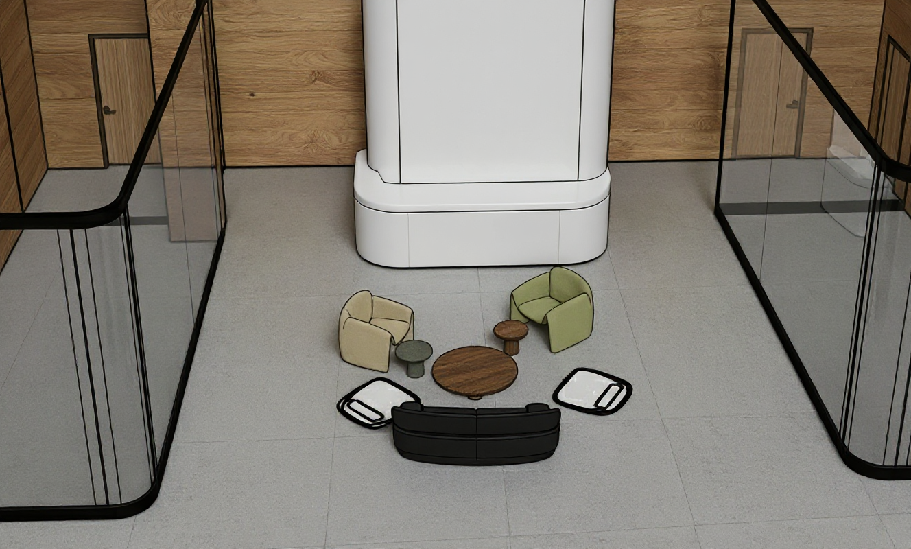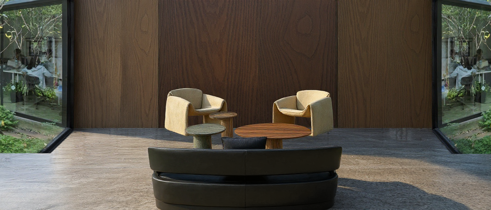 please stage this table in a room where the floor is concrete the walls are a neutral white with white baseboard this picture will be used on our website to showcase this style of table make it look like the reference image
