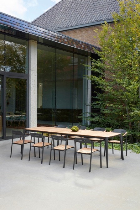 render an elegant outdoor dining setting with a contemporary design a long wooden table with a warm medium brown finish stands as the centerpiece surrounding it are sleek modern chairs with black frames and wooden seats that match the table the setting is on a smooth light gray concrete patio in the background large glass windows reflect a serene garden view with lush green foliage a tall natural stone column flanks the entrance the roof tiles are in shades of dark gray complementing the tranquil upscale atmosphere the scene is under a clear blue sky with a few fluffy white clouds suggesting a peaceful sunny afternoon