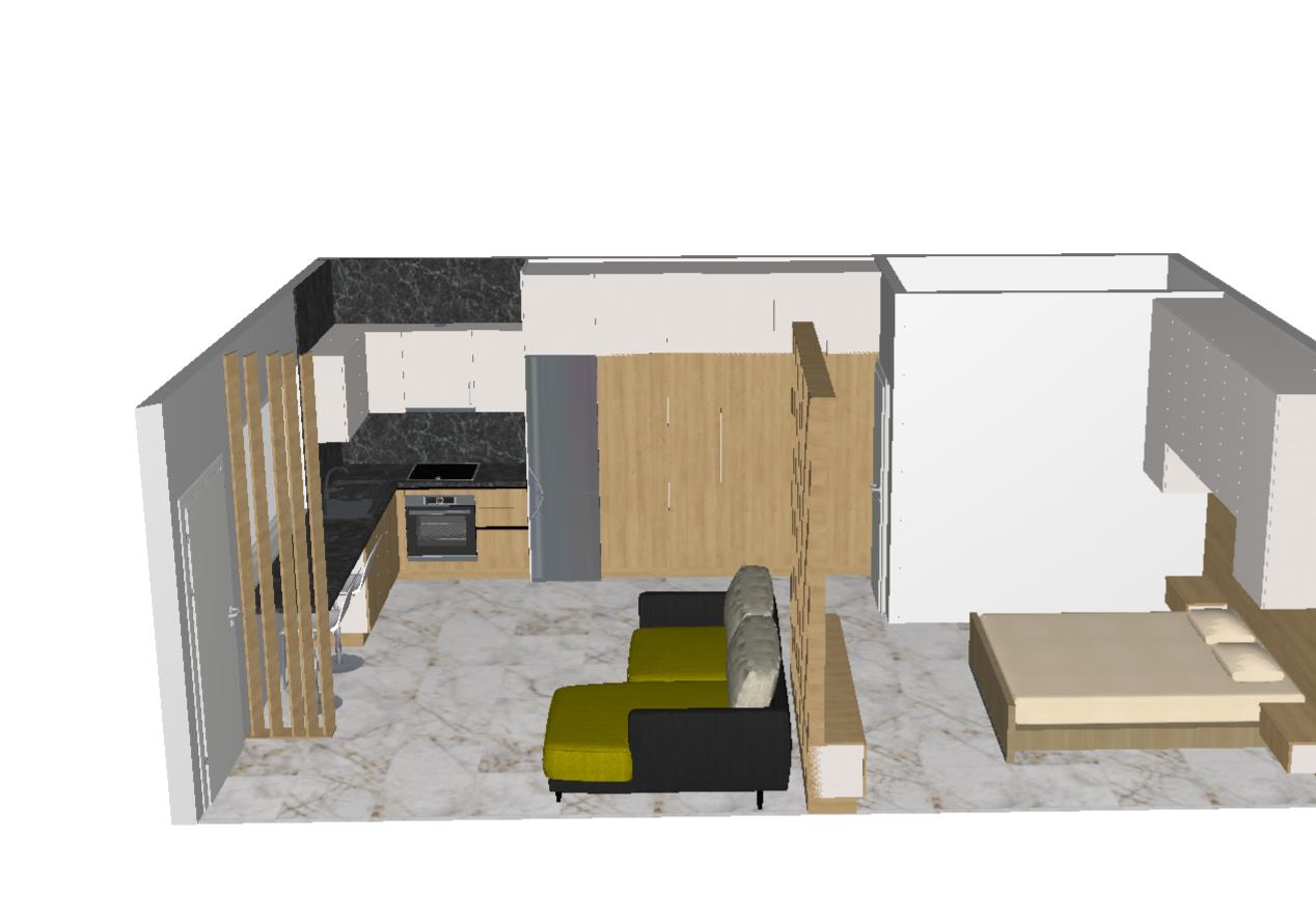 a modern bedroom apartment and kitchen interior with natural wood cabinets in a warm walnut shade brushed stainless steel appliances and backsplash tiles in a soft gray color the atmosphere is warm and welcoming with soft warm lighting that highlights the textures the walls are painted in a soft gray color complementing the smooth glossy white countertops the floor features elegant light beige tiles to create a serene atmosphere