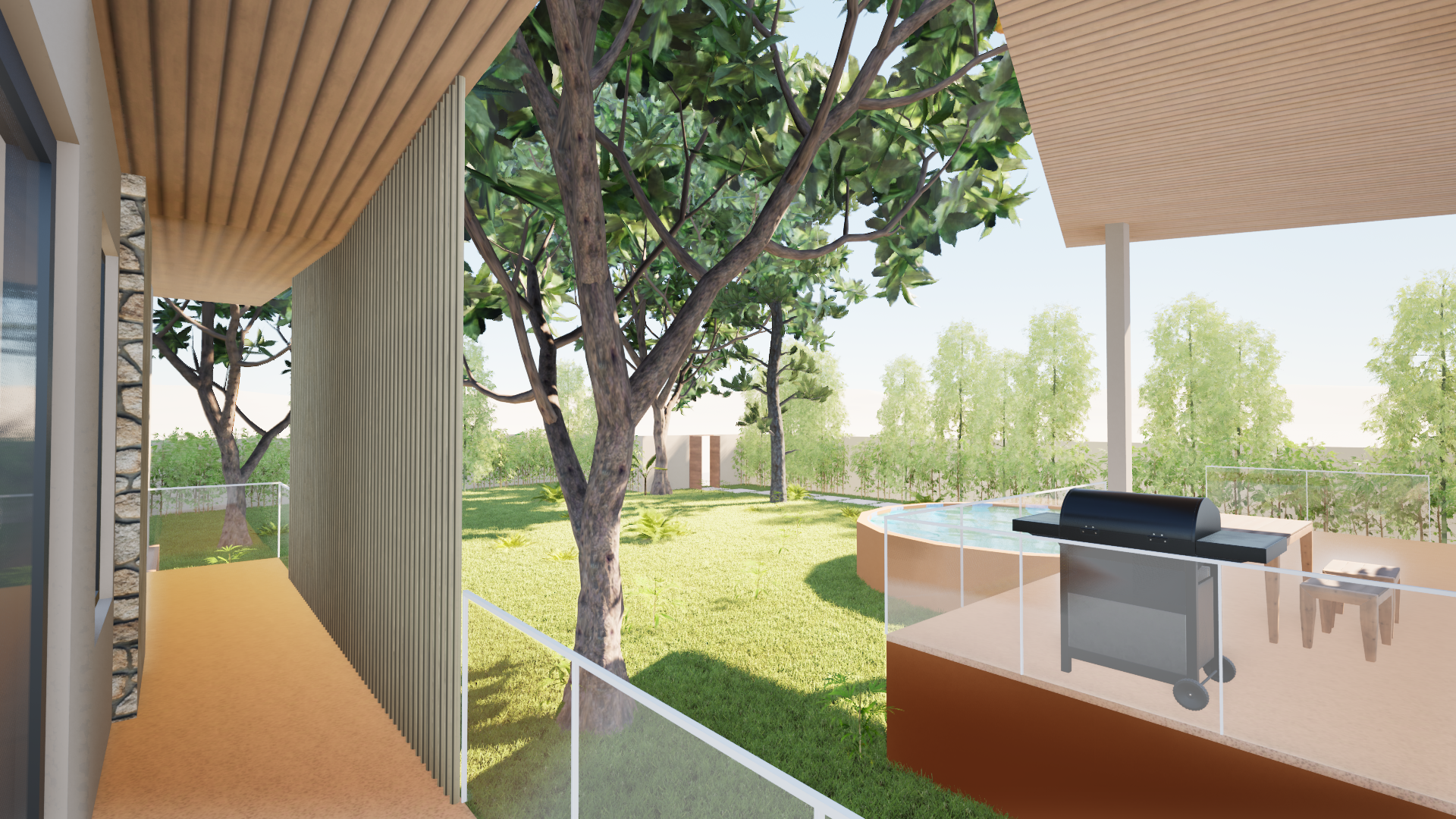 enhance this architectural 3d render to achieve ultra realistic photorealistic quality improve all materials and textures with physically accurate pbr maps albedo roughness bump displacement surfaces should show natural imperfections such as subtle stains micro cracks edge wear and realistic reflections glass must have proper thickness slight reflectivity and accurate light refraction metals should include natural roughness variation and soft reflections wood textures must show real grain depth and tonal variation concrete and stone should have realistic surface irregularities and fine detail upgrade lighting to natural daylight conditions with realistic global illumination use soft physically accurate shadows ambient occlusion bounce light and high dynamic range sky lighting ensure balanced exposure with cinematic contrast and natural color grading enhance vegetation with highly detailed lifelike plants and trees including varied leaf tones translucency subsurface scattering natural randomness and realistic density add subtle wind movement if supported avoid repetitive patterns improve landscaping with natural ground variation realistic grass distribution soil detail small imperfections and organic transitions between materials add subtle environmental realism such as slight weathering minor dirt accumulation near edges realistic reflections in windows and soft depth of field final result should look like a high end architectural photograph taken with a professional dslr camera natural lens perspective 35 50mm ultra high resolution sharp details and true to life materials
