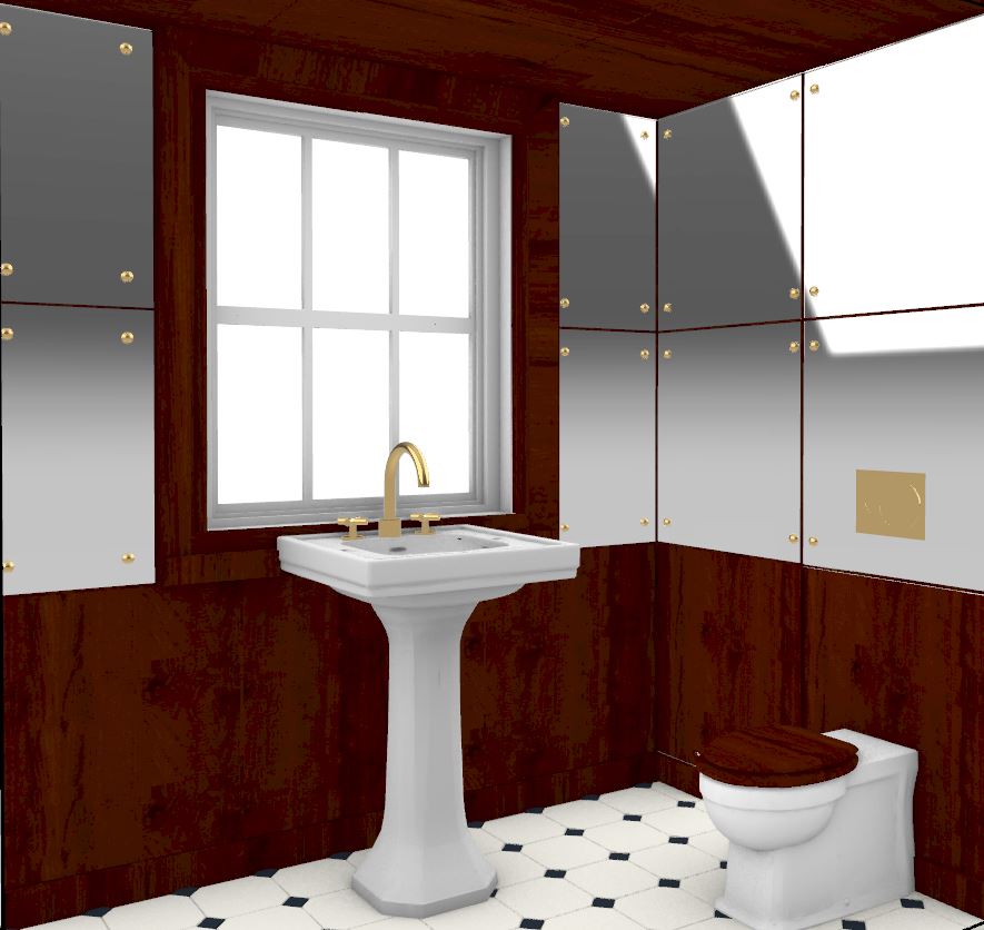 make this realistic mirror walls with mahogany wood dado and ceiling and brass fittings