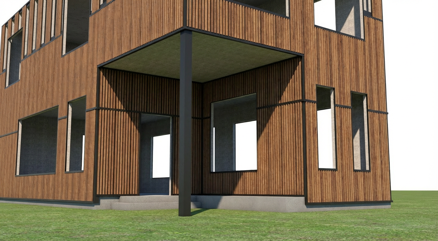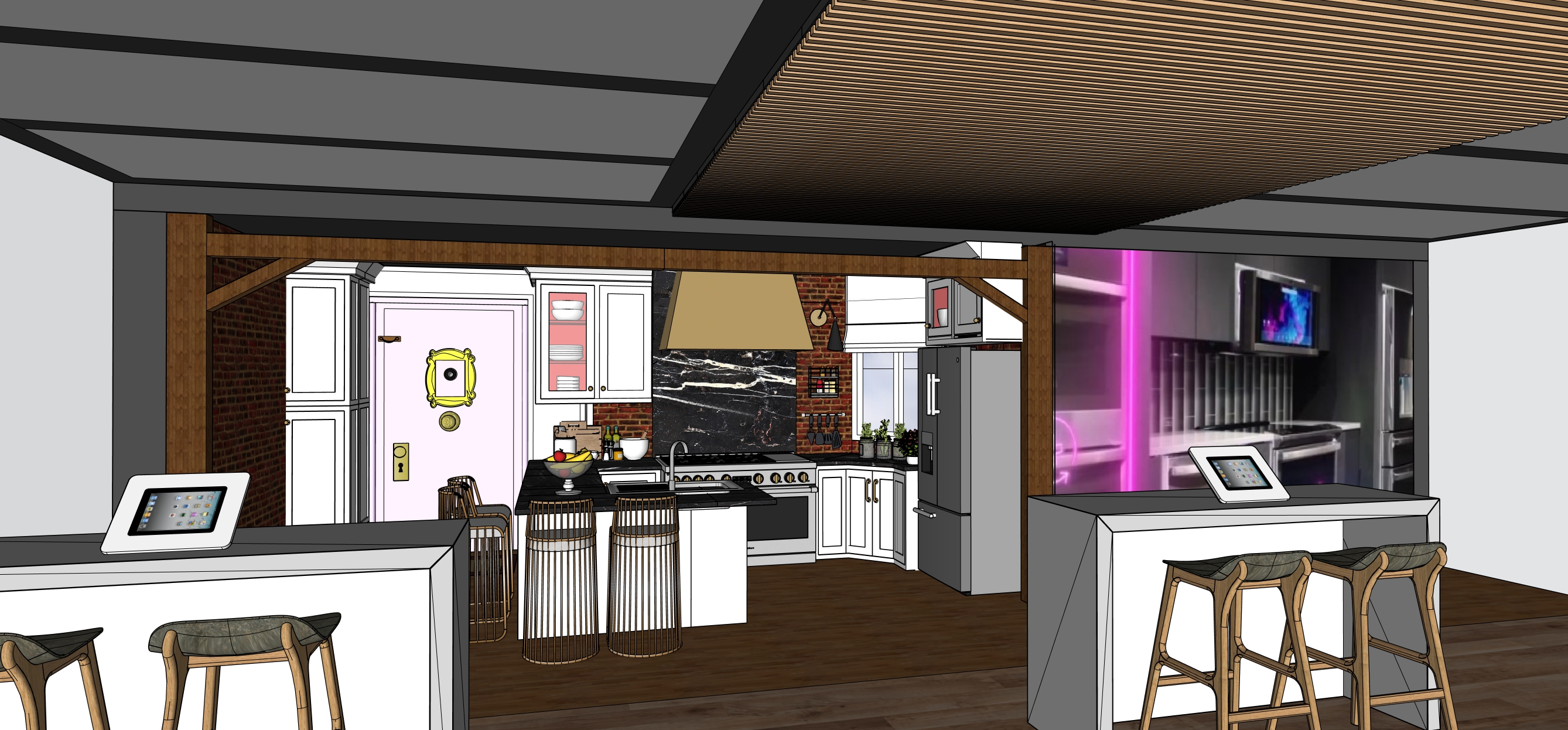 create a cozy stylish kitchen interior with a warm inviting atmosphere the wooden ceiling has a rich walnut finish the walls are light gray complementing the modern vibe use white for cabinetry adding a sleek contemporary touch the kitchen island features a black marble countertop providing elegant contrast include a brushed gold range hood for a luxurious accent add textured brick on one wall painted in a warm brick red incorporate a led accent video wall with commercial content on the appliances used in the vignette use dark brown wooden flooring to unify the space bar stools with dark wooden frames and soft gray upholstery add comfort ensure soft ambient lighting to enhance the overall warmth and appeal