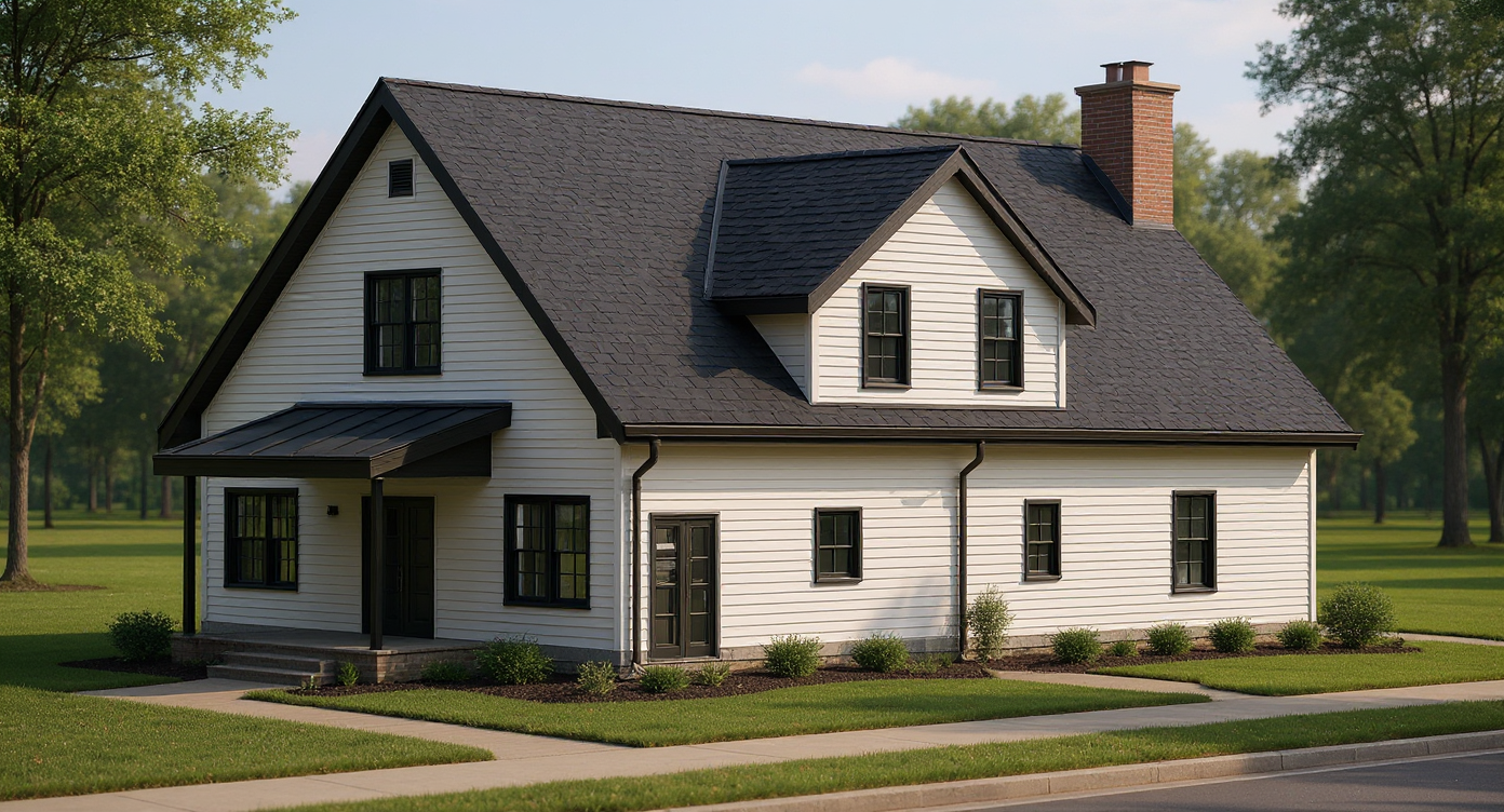 create and exterior elevation with 12 foot ceilings gabled living room white metal sheets for siding black metal roof two courtyards off the front on either side