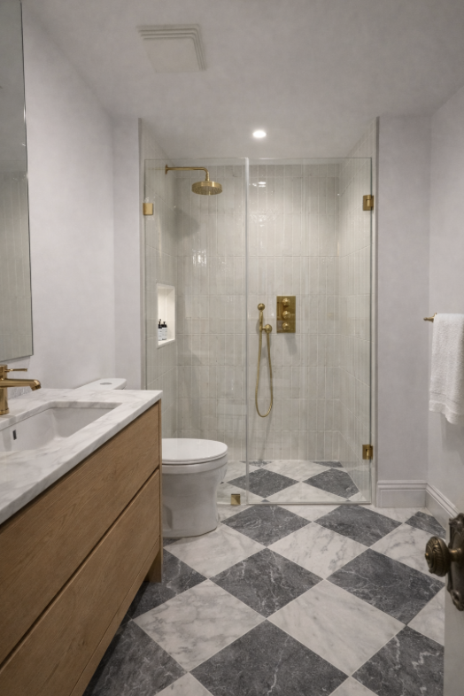 add a curb wall 3 tall with sill to define shower glass enclosure should be modified to sit on curb wall