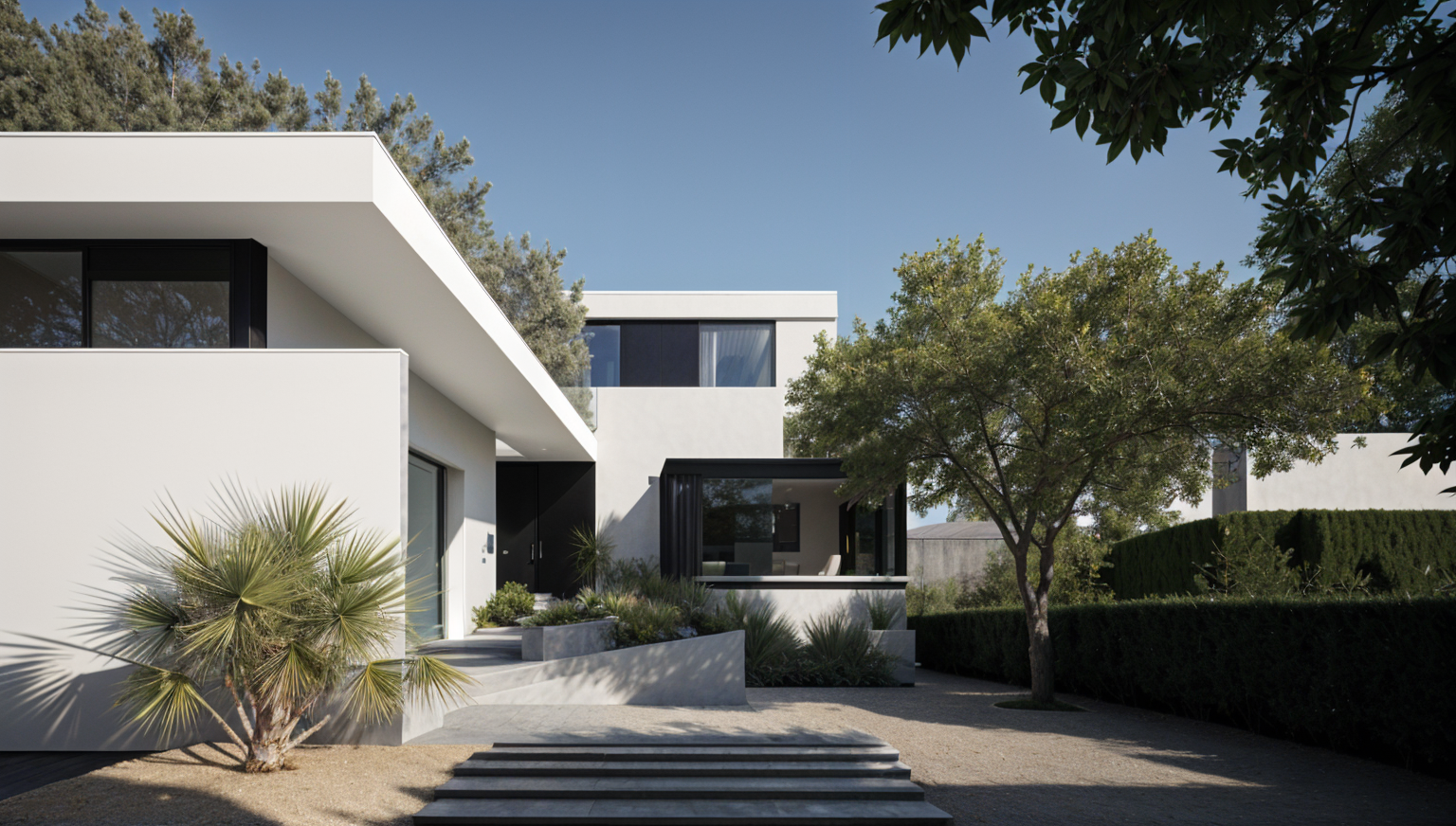 exterior shot keeping the exact design and proportions from the original style the building in a modern mediterranean look with white plaster walls black joinery glass balustrades with a simple single steel handrail and balusters include a grassy slope landscape in the foreground farm in background render the final image as a coloured pencil sketch with soft textures and hand drawn qualities