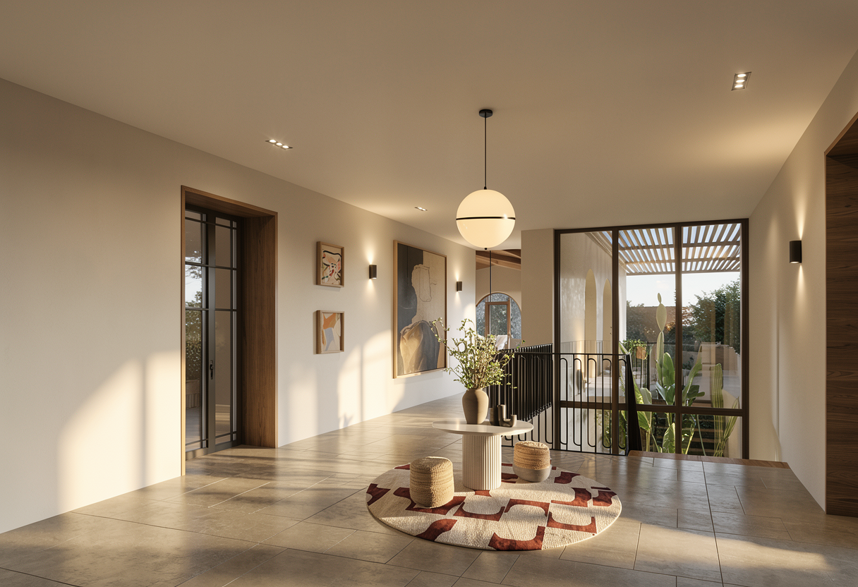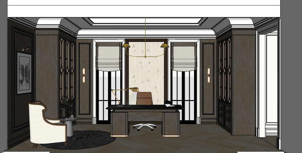 render senyata mungkin tambah indirect light di plafon yang tengah dan dalam lemari lemari dengan kaca coklat tembus lantai vinyl krim jangan ubah bentuk dan warna material yang lain