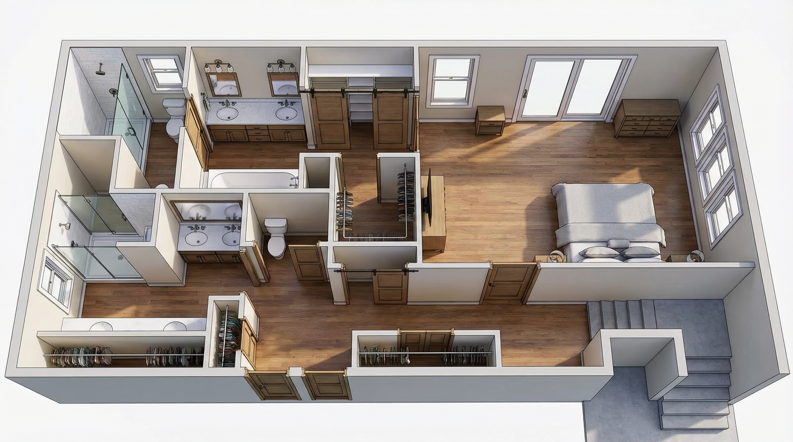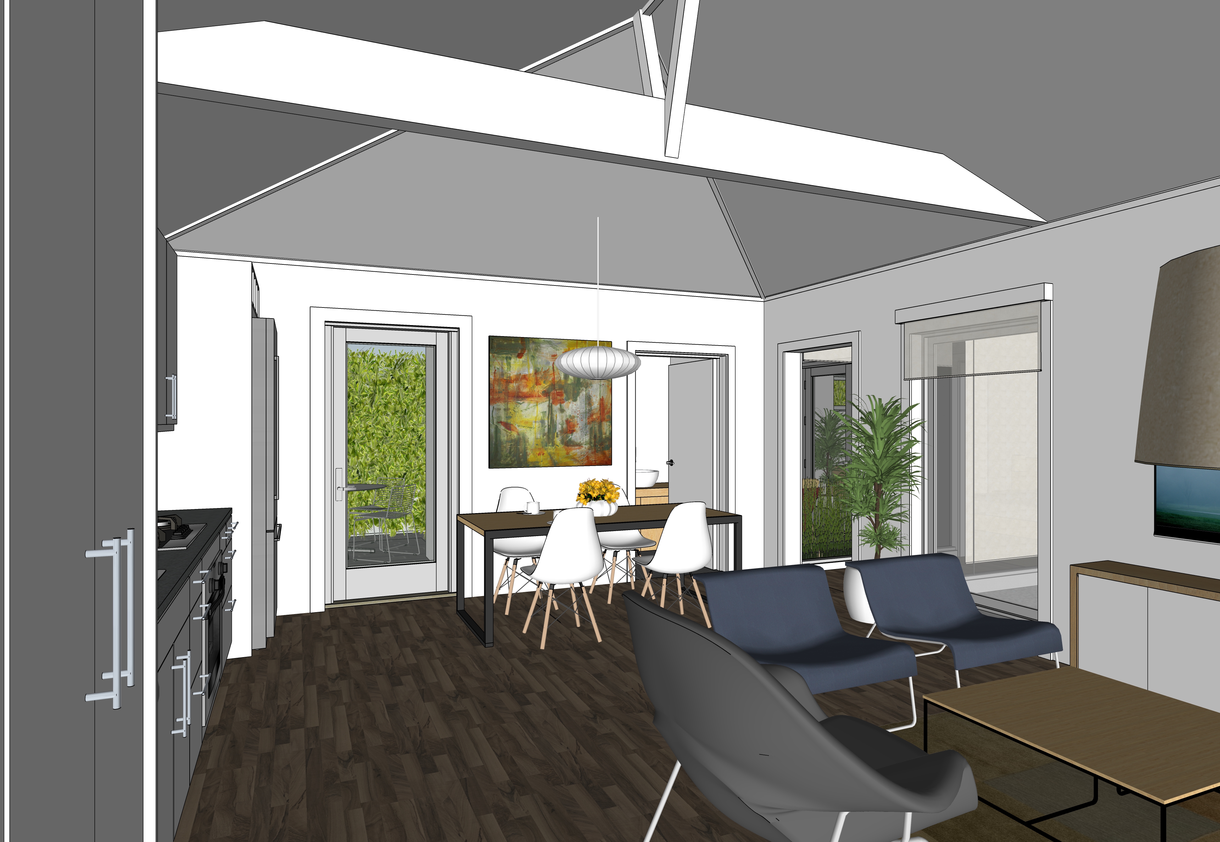 add a woman facing the sink in the kitchen make the space brighter with more ambient light and less contrast with the shadows
