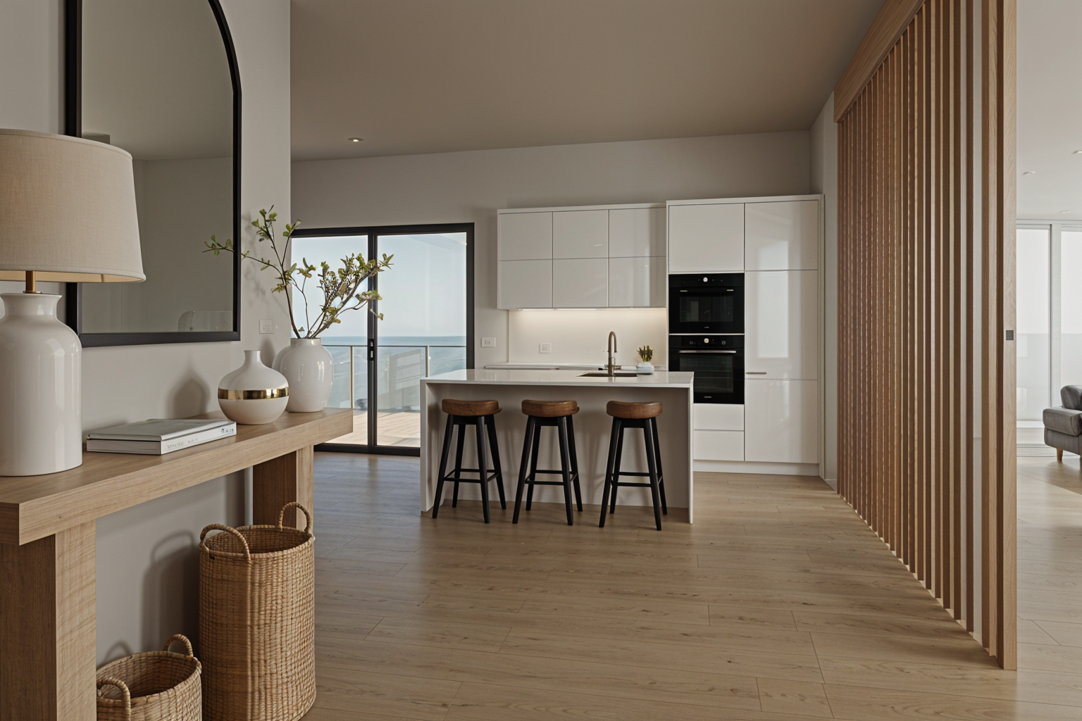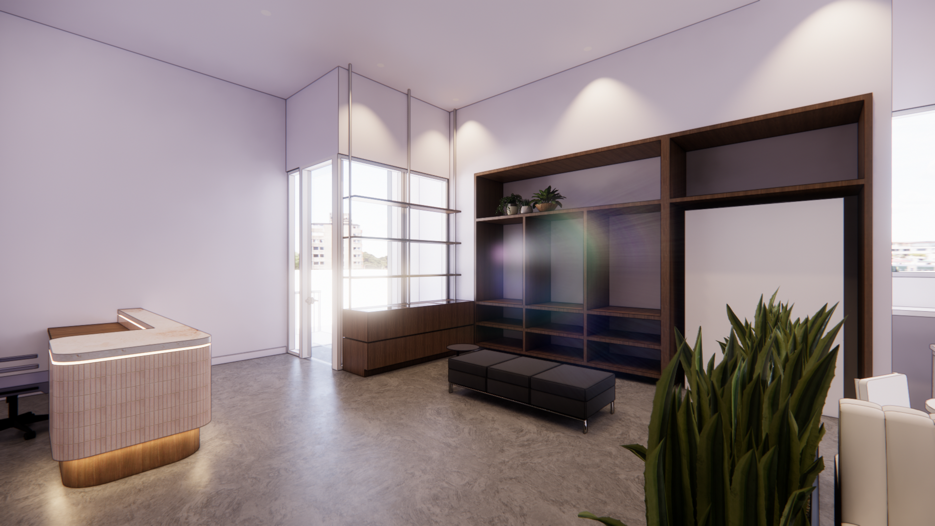 reception and retail lobby interior warm inviting and polished high end natural daylight through tall windows layered with warm recessed and accent lighting modern reception desk with curved edges clad in light stone and textured wood softly backlit for an elevated look walls finished in smooth venetian plaster luminous and refined adding depth and sophistication above the desk a large decorative pendant light with a tulum inspired coastal luxury vibe woven natural textures as a dramatic focal point on the shelves in front of the glass windows the shelves display premium padel rackets behind the desk custom walnut shelving staged as a retail display sleek rods with hung clothing folded garments curated accessories and greenery large cubby on the right fitted with a sleek contemporary snack vending machine integrated into the millwork comfortable modular seating in premium leather or fabric low profile with a refined side table flooring is the existing sealed polished concrete slab layered materials warm wood venetian plaster brushed metals and natural textiles lush greenery for vibrancy and wellness color palette of whites warm grays walnut brown soft taupe accented with greenery and subtle bronze brass atmosphere boutique hospitality meets contemporary retail lounge professional yet welcoming high end but approachable ultra realistic rendering with emphasis on material richness venetian plaster walls warm lighting and refined retail staging