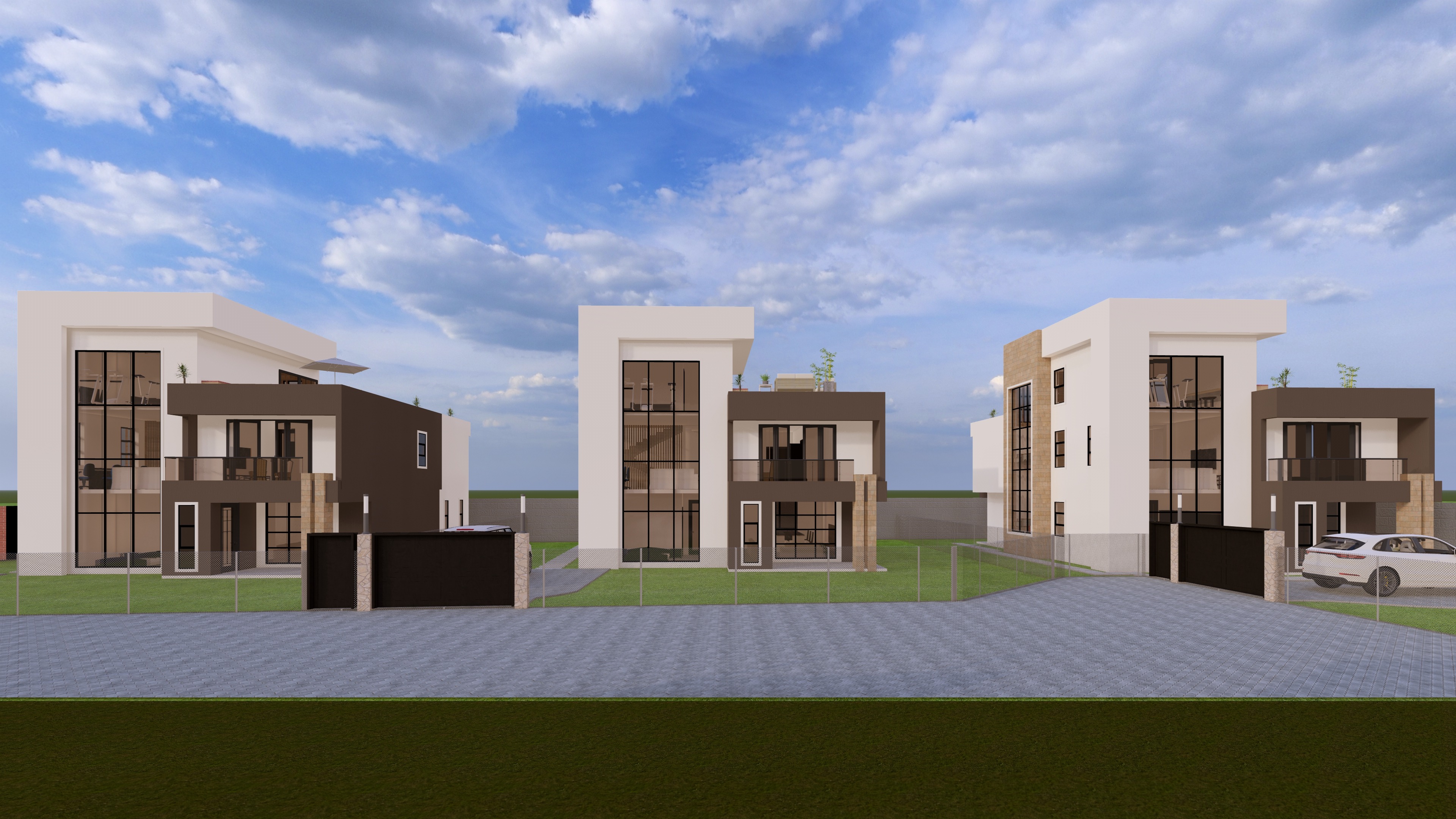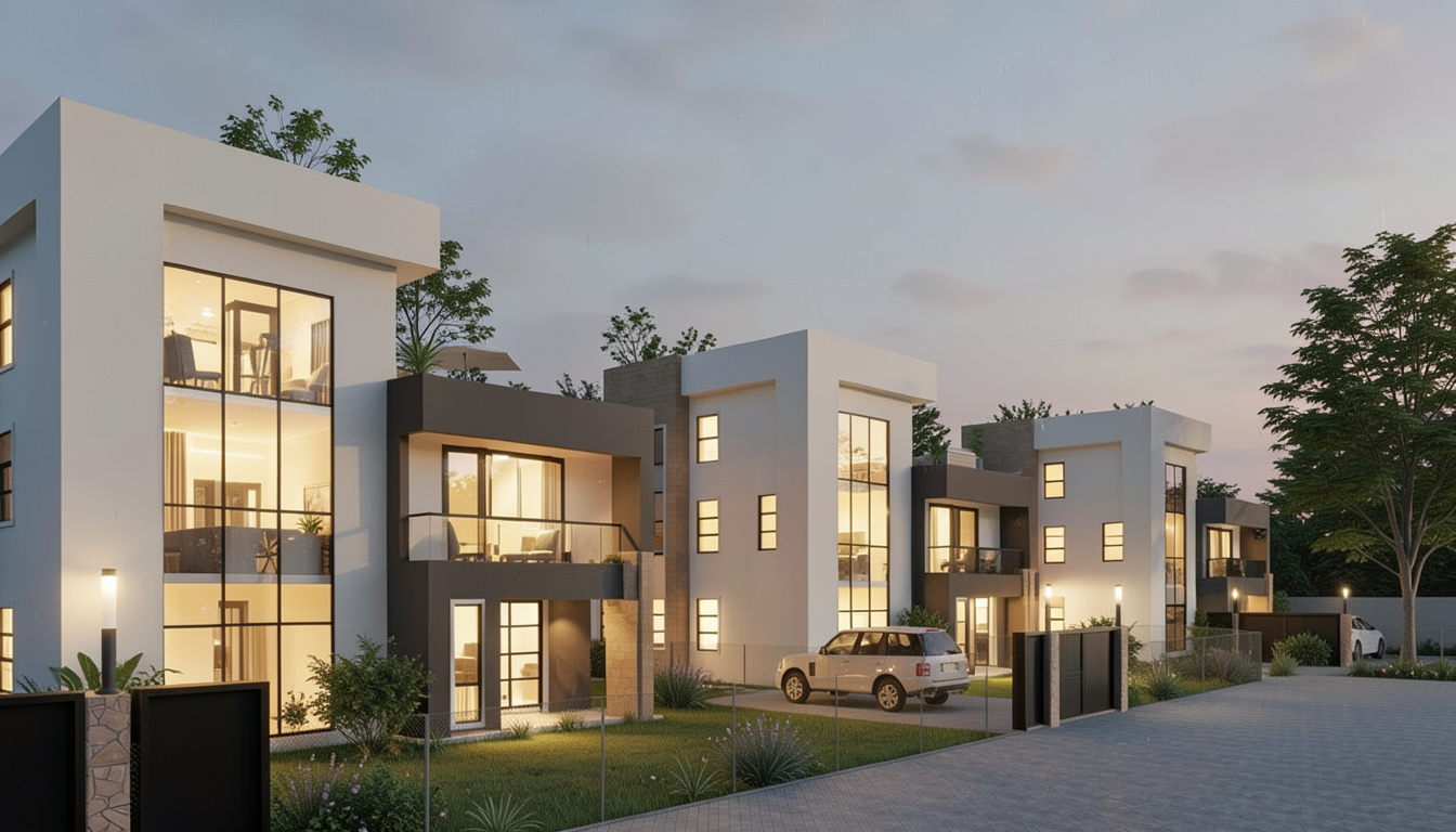 this is a housing estate add very few trees and vegetation in background to give it context have indoor warm lighting