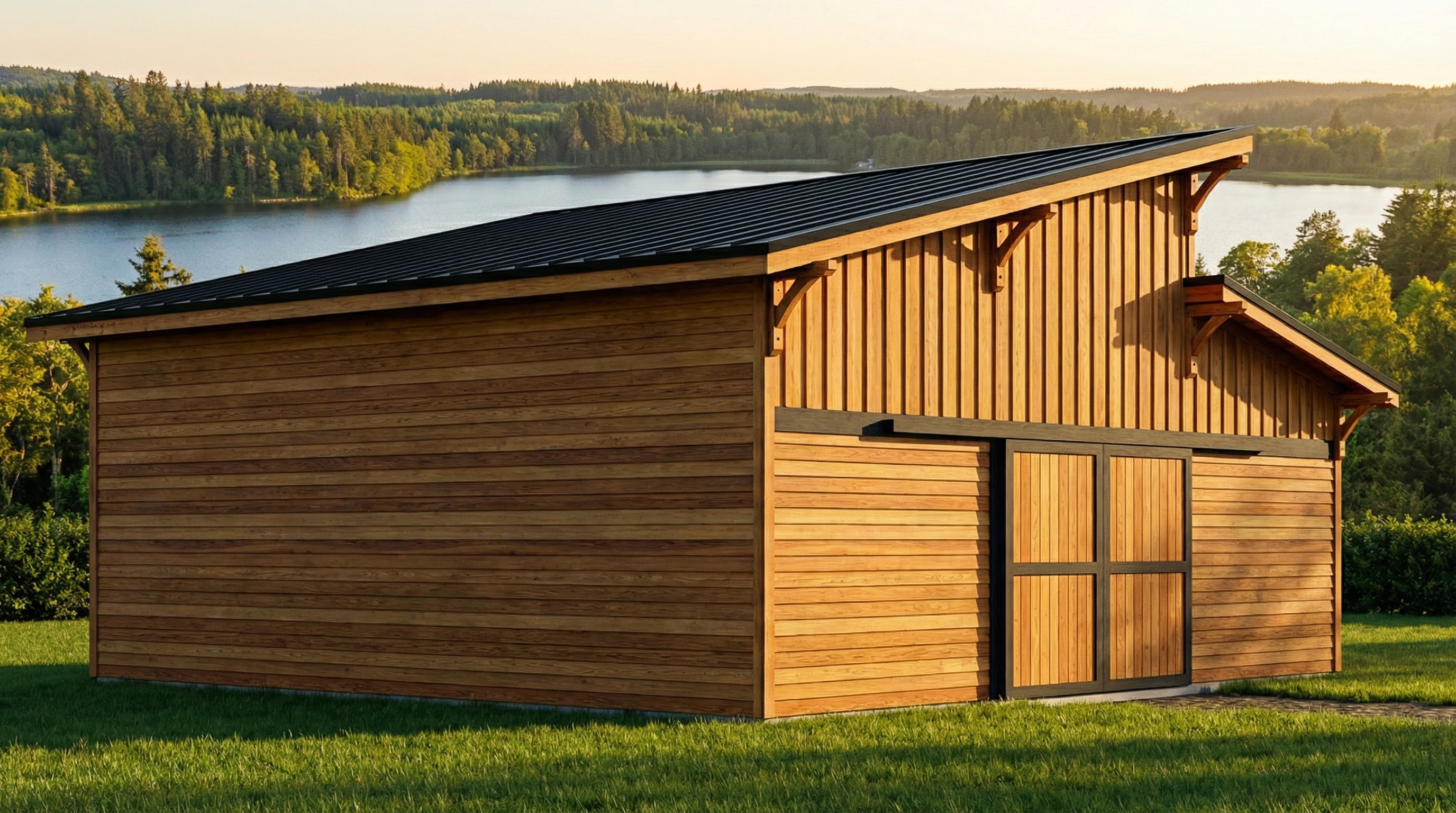 clean timber clad architectural exterior rendered in cinematic bright golden hour lighting dark trim around sliding barn doors warm vertical cedar board batten wood siding on the top floor horizontal cedar tongue groove siding on the lower floor horizontal cedar tongue groove siding on the left side of the building with similar simple minimal grain pattern grass foreground black standing seam metal roof visible prominent cinematic lake with surrounding trees landscape in the background natural wood textures high fidelity photorealistic visualization crisp shadow falloff refined facade geometry richly detailed grain patterns soft atmospheric depth premium architectural photography mood ultra clean composition and materials