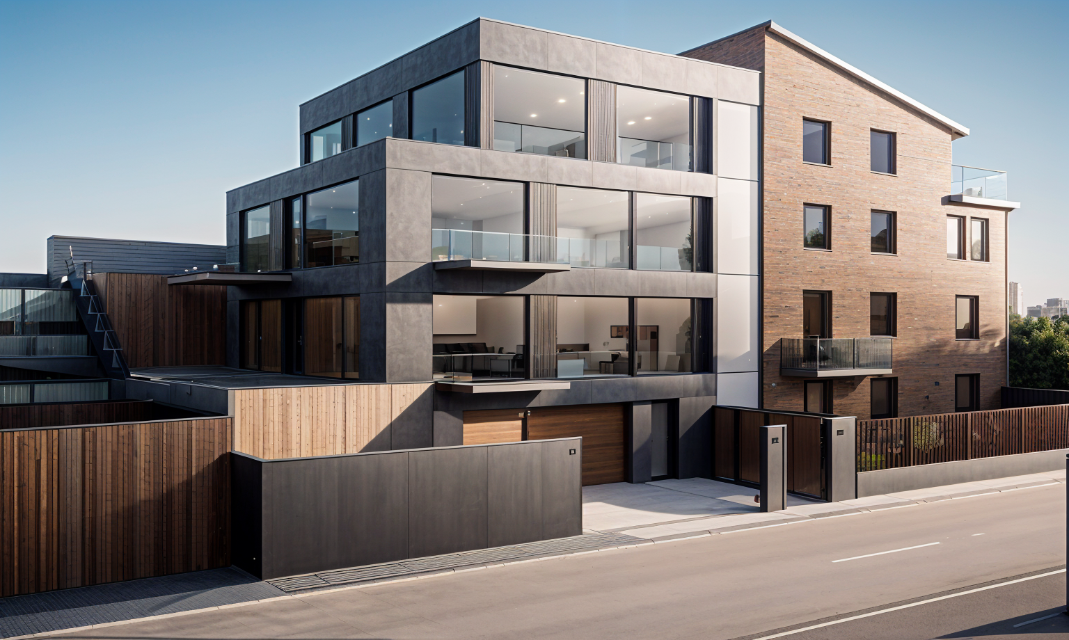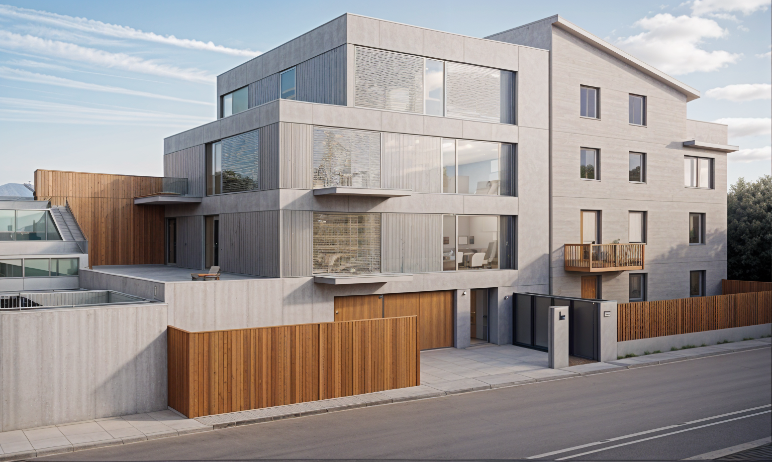 appartmant house simple facade plaster grey blue plaster bottom part is for parking concrete fance architecture
