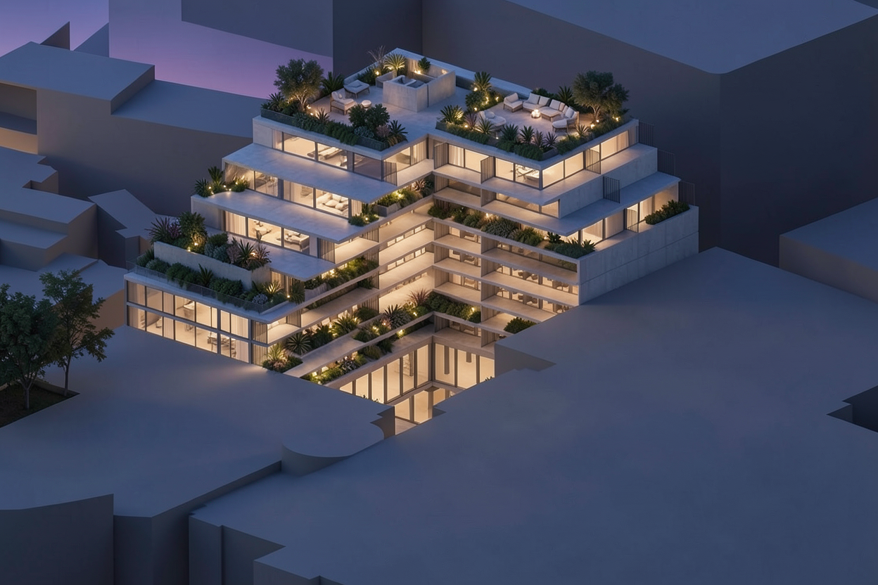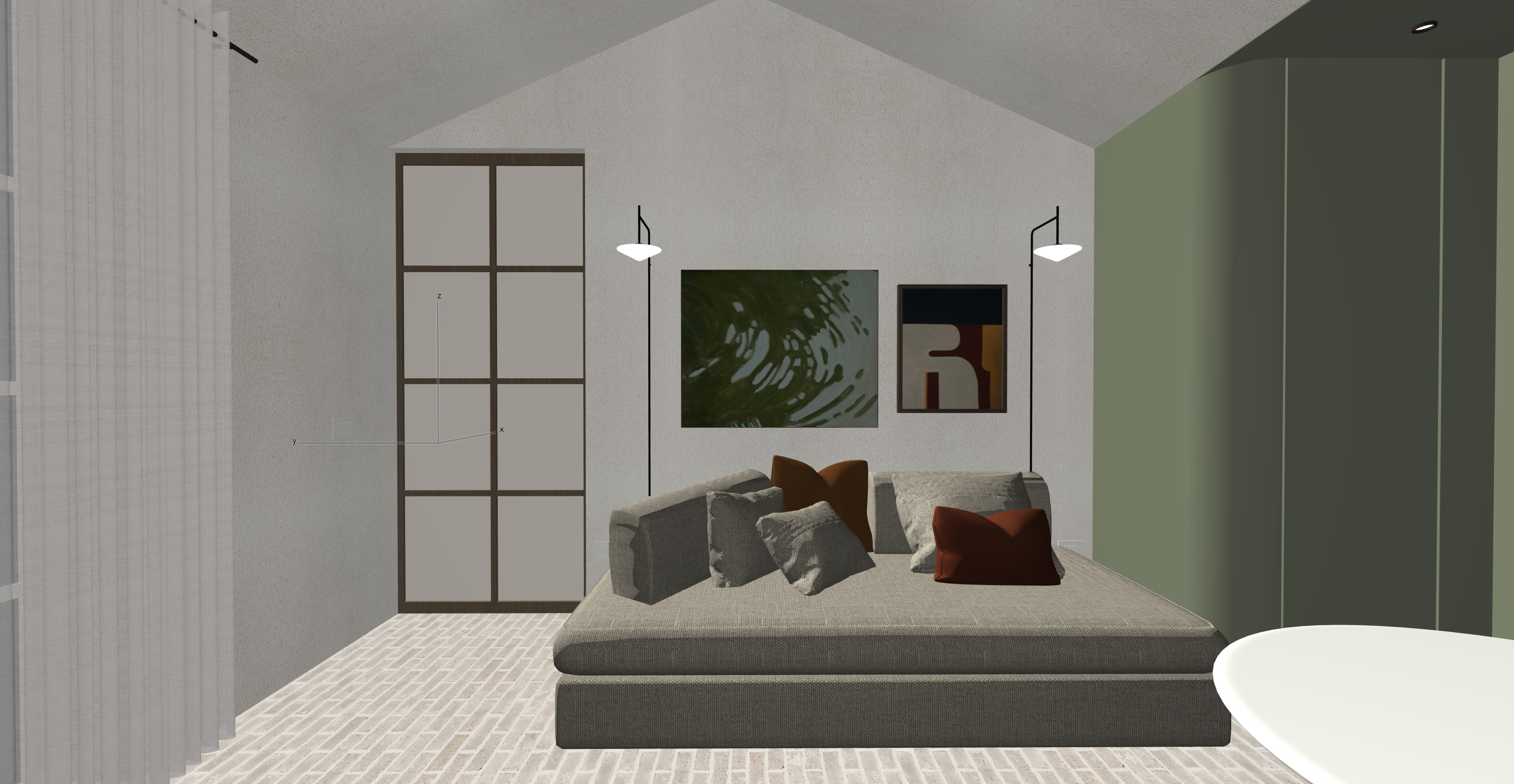 le pareti sono intonacate bianco caldo intonaco con texture come muri esterni mantieni tessuto divano mantieni mobile ingresso laccato verde accendi luci luce scena pomeriggio porta in specchio ambrato con telaio a quadrati in rovere spazzolato