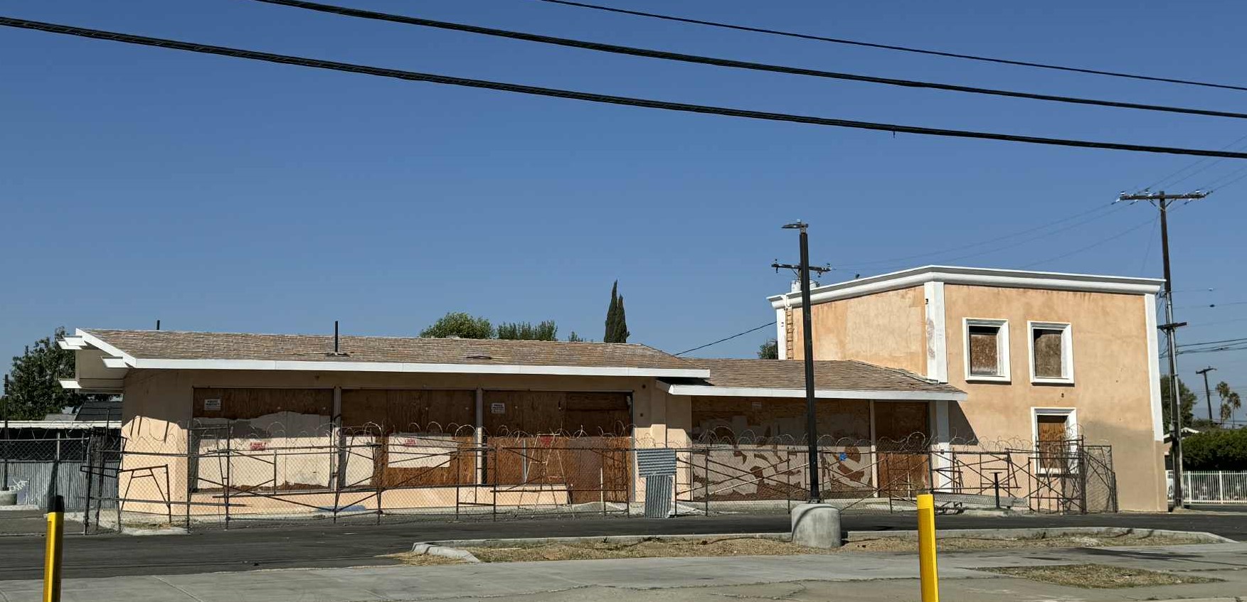 convert to modern retail building with black wood siding glass and corten steel accents on a sunny california day with native landscape and trees