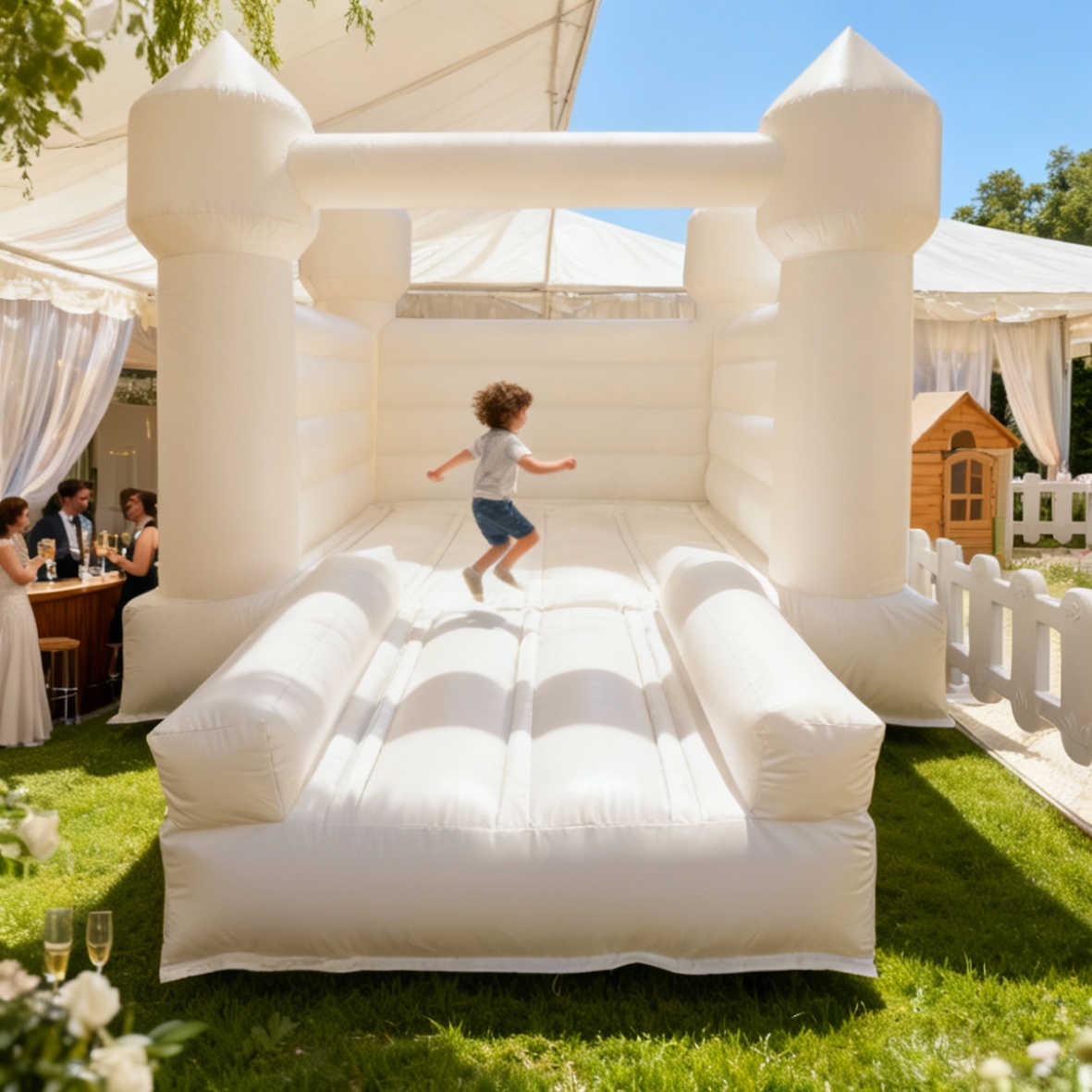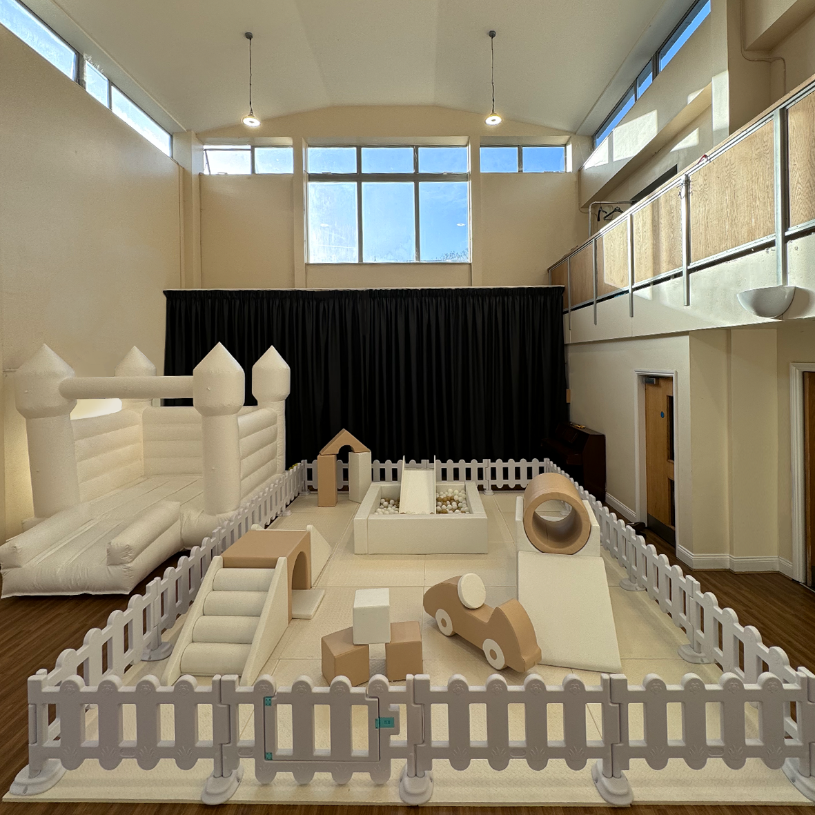 place soft play outdoors at a summer wedding with sun coming through the trees table decors have red pink and orange summer flower decorations on