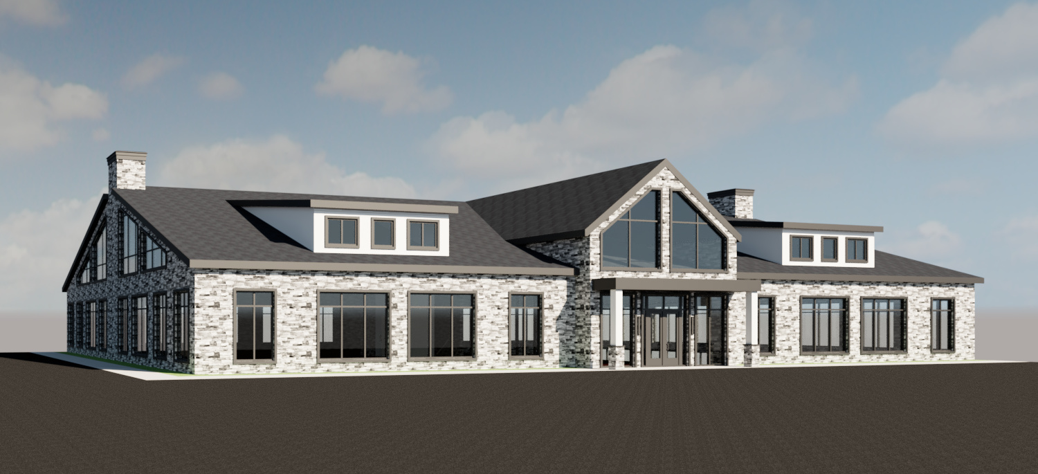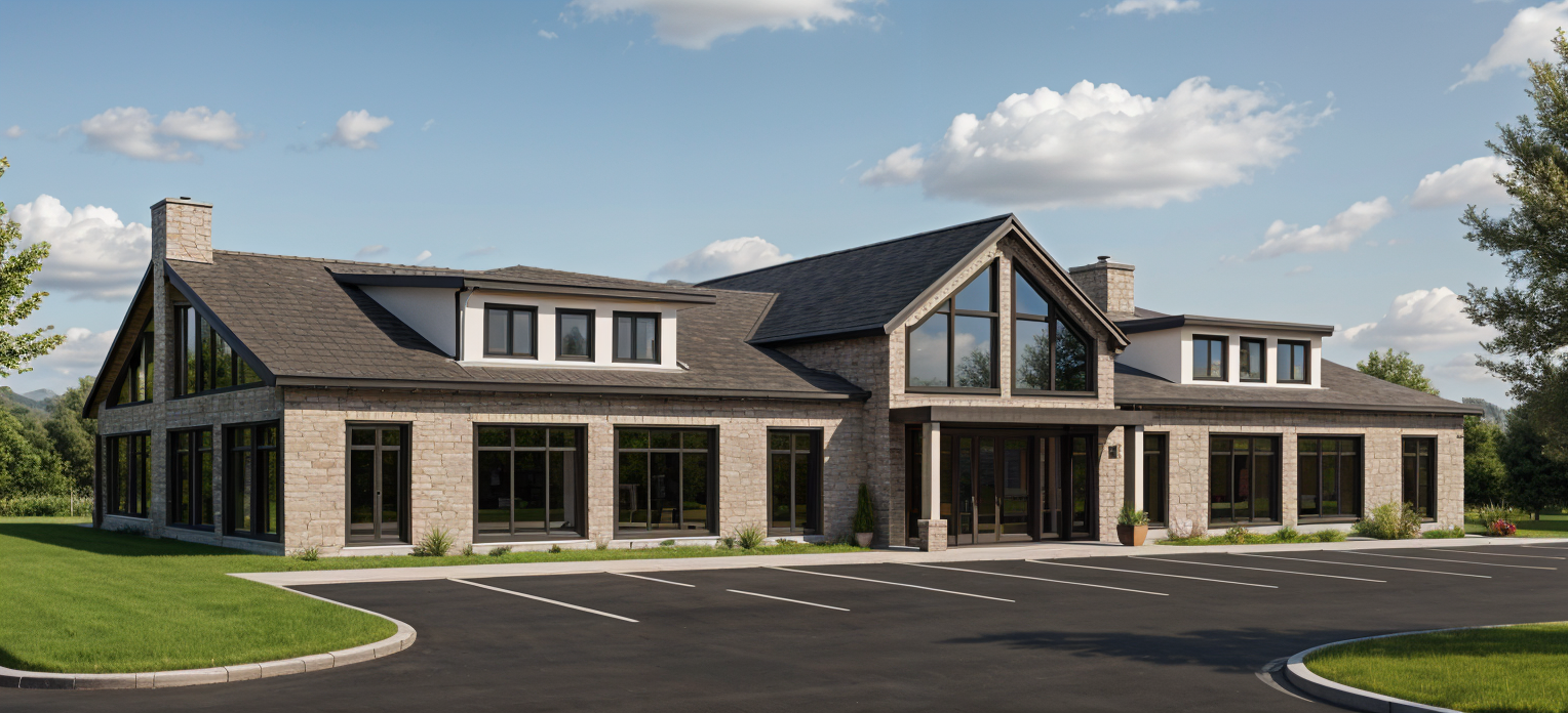 photorealism blue skies lightly cloudy landscaping around the building native to upstate new york parking spaces in front of the building thin multiple light grey staggered stone facade white columns in the front